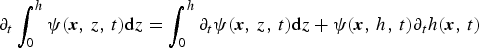 $\partial _t \int _0^h \psi ({\bi x},\,z,\,t) {\rm d} z = \int _0^h \partial _t \psi ({\bi x},\,z,\,t) {\rm d} z + \psi ({\bi x},\,h,\,t) \partial _t h({\bi x},\,t)$