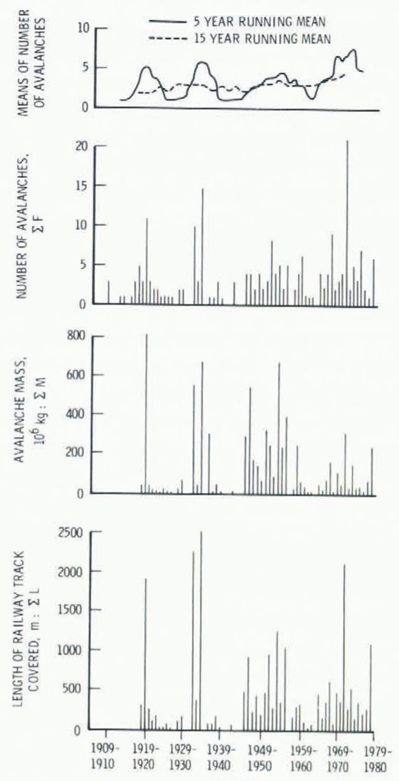 The most reliable measures of activity are considered to be those for number of avalanches and length of track covered. The series for the mass of avalanche snow involves numerous assumptions, but because such long-term series have not been available before they are worth reporting. Furthermore, estimates of mass allow magnitude-frequency relations to be determined.