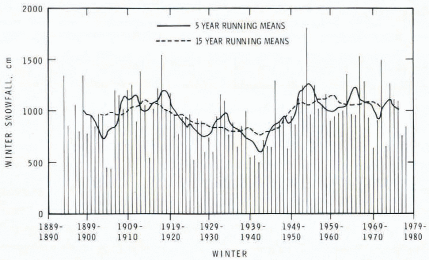 The 15-year running means for winter snow-fall at Rogers Pass also show no linear trend, but there is a suggestion of a broad peak from approximately 1910 to 1920, followed by a broad trough from 1935 to 1945 and a rise to another broad peak in recent years (Fig. 2). The five- year running means illustrate smaller-scale fluctuations superimposed on these long-term variations.