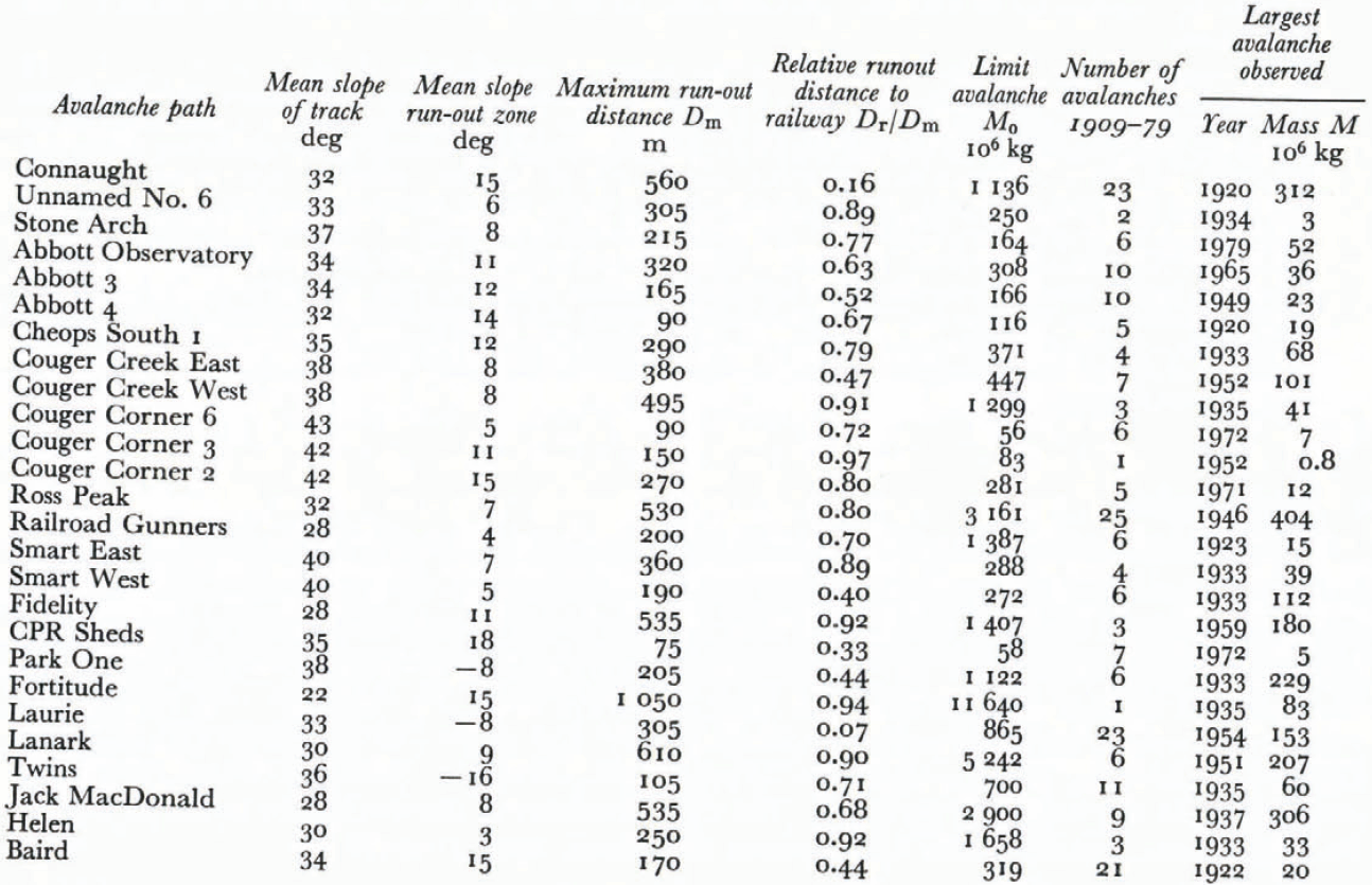 (d) for some avalanche paths such as Fidelity it was obvious that only the very tip of a large avalanche had cut the railway line, and the characteristic cross-sectional area was not a good one; in these cases A was calculated by replacing L with the average width of the run-out zone.
