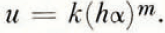 iii. Friction an increasing function of velocity of sliding alone. f = Cu 1/m where f is the frictional force per unit area, u is the sliding velocity, m is a positive number, and C is a constant (or rather is characteristic of the bedrock, depending on its roughness, but one supposes this to be uniform). If we now combine this with the relation  which relates the frictional force with the density of ice ρ, the acceleration due to gravity g, the glacier thickness h, and the surface slope α, a law which is valid whenever the longitudinal stress is uniform, we obtain the relation