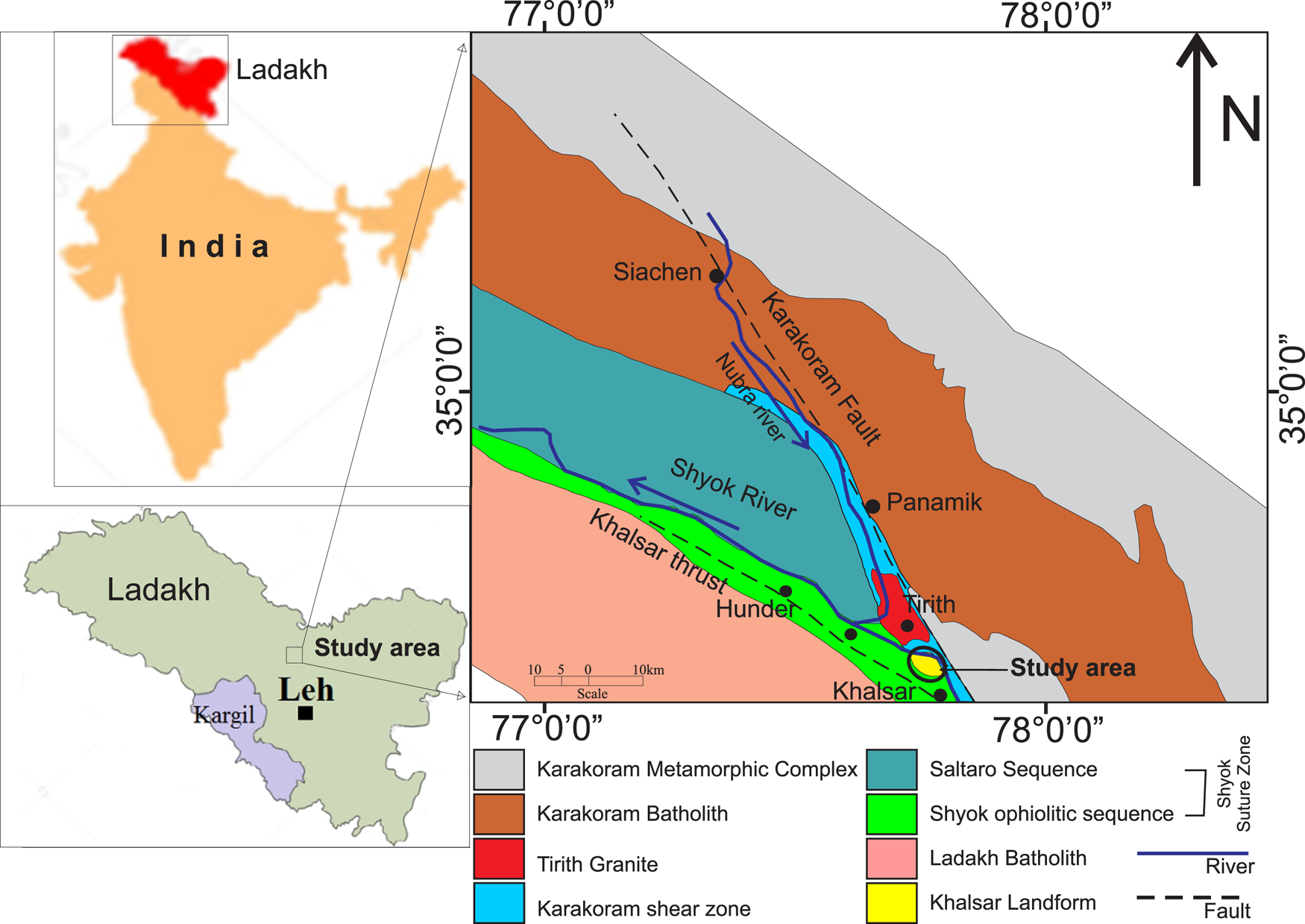 The main aim of the paper was to report the glaciotectonic activity in the Indian Himalaya, where not much research has been carried out on the subject. The paper reports the field-based sedimentological and glaciotectonic characteristics of the Khalsar landform along Leh–Siachen and Diskit road (NH-1D) near the confluence of Nubra and Shyok valleys and discusses the glaciotectonic source of the landform. The internal glaciotectonic structure of the landform is exposed in the road-cut section on the left bank of Shyok River between Khalsar village and T-road junction and therefore, provides a rare opportunity for its study (Fig. 2). The study, being the first of its kind, will open new research aspects of glaciotectonism in the third pole with wide regional implications.