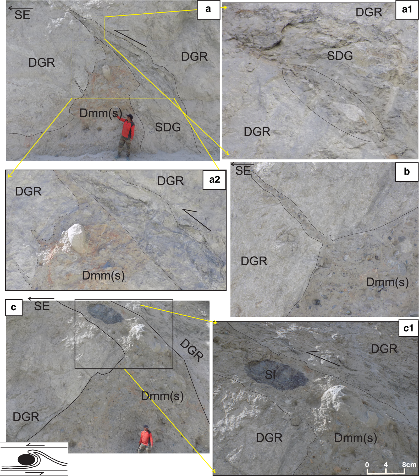 Two well-developed megascopic shear fabric patterns have been identified in the exposure, both showing the top to the south direction. Thin shear bands and zones are consistently found within the decomposed granite (Figs 9d, e). The thicker shear zones (SDG) show a nearly linear flat base and curved convex top with south vergence, indicating it is a glaciotectonic fault-related fold (Figs 9c, d, 10a2). The contact between the diamicton sediments and decomposed granite shows asymmetrical antiformal drag folds, ductile shearing, boudinaged shear lenses and thrusting. The diamicton sediments (Dmm) show conspicuous convex up drag fold noses protruding within the overlying decomposed granite (DGR). Such features within the overlying decomposed granite consistently show southward dragging and tilting. These features have been related to the prolonged thin skin glaciotectonic thrust propagation folds (Figs 10a, c). The thrusting and shearing have led to the dragging and alignment of pebbles and boulders of diamicton (Dmm(s)) within the overlying decomposed granite (Figs 10a, c). The dragged contacts between unconsolidated Quaternary diamicton (Dmm(s)) and decomposed granite (DGR) also show the shear fabric of sigmoidal and delta-type porphyroclasts of feldspar within the high-strain zone of mixed granitic and clay groundmass (Figs 11a–c). The presence of such a narrow mylonite fabric indicates sufficient competence in the rheologically ductile clay-dominant diamicton, which is attributed to its subglacial or proglacial partial frozen condition. The overall appearance and deformation intensity in small-scale ductile fabric present in the Khalsar landform is similar to the chalk hill of northeast Norfolk, UK (Burke and others, Reference Burke, Phillips, Lee and Wilkinson2009). The presence of diamicton (Dmm) all along the fault, shear and thrust zones, verging shear fabric in fault-related folds, verging thrust propagation drag folds and ductile-sheared porphyroclast indicates the role of thin skin glaciotectonic thrusting in the emplacement of the Khalsar landform rather than orogenic thrusting.