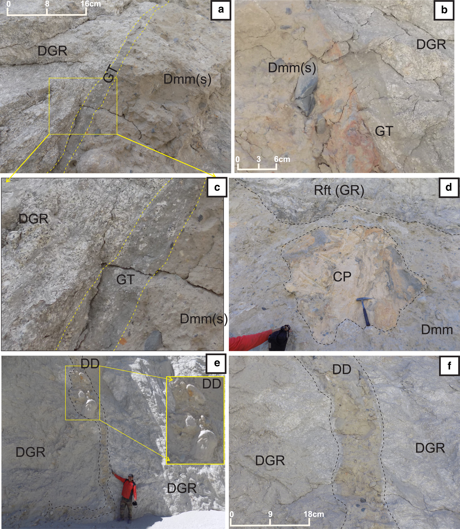 Figure 11. Field photos (refer to b3 in Fig. 4b) showing ductile glaciotectonite and SSD features in Khalsar landform. (a–c) Thin cataclasite glaciotectonite zone at the contact of diamicton (Dmm(s)) and decomposed granite (DGR), the cataclasite shows mylonite like ductile fabric with feldspar porphyroclasts within the granite and mud dominant matrix, indicating sufficient strength in the diamicton material to undergo ductile deformation at the surficial level, which is attributed to its frozen to partially frozen nature, (d–f) the diamicton water escape structures and dykes with large boulders indicate partially frozen slurry material under very high stress.