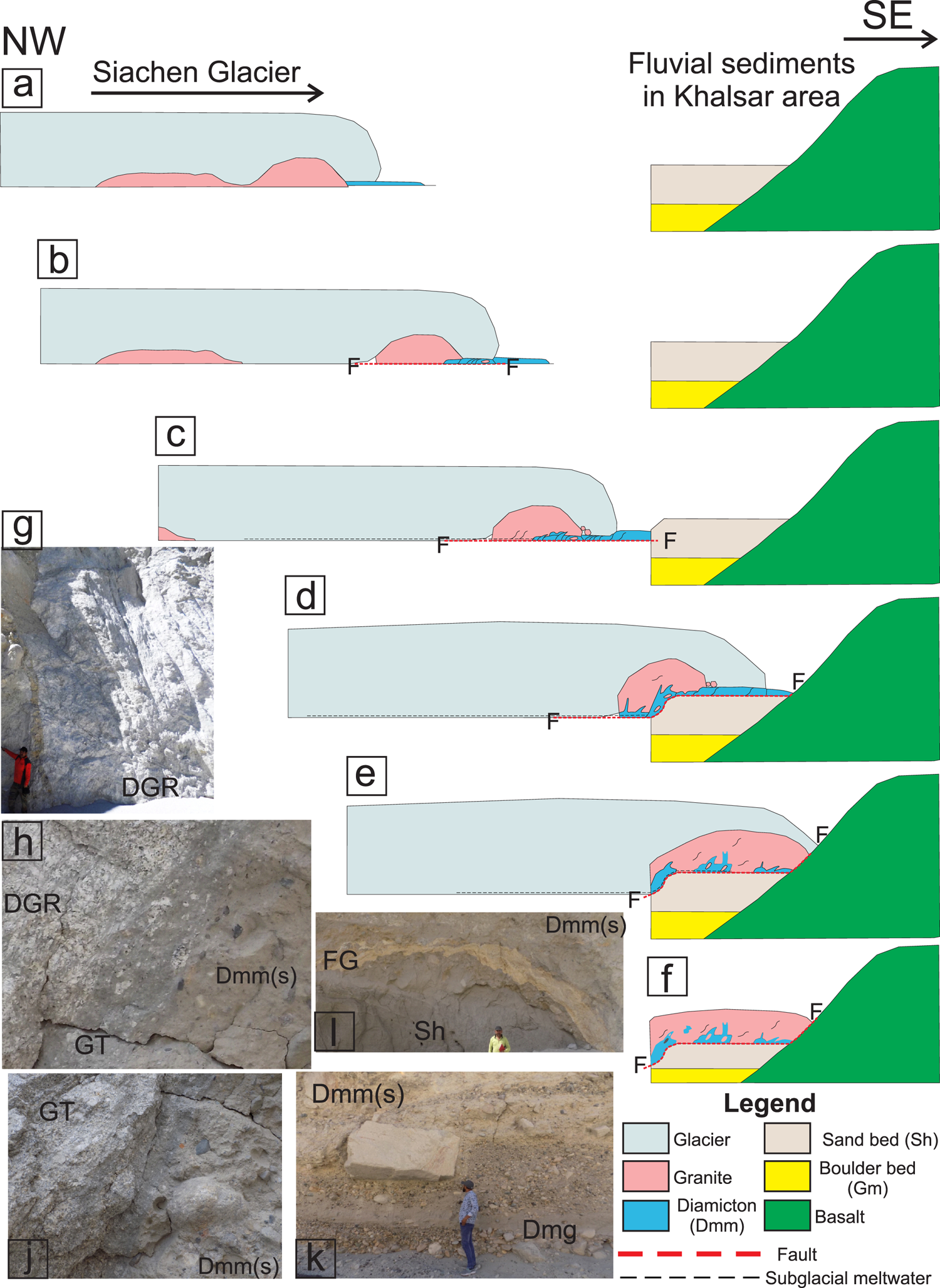 Figure 12. Glaciotectonic model proposed for the origin of the Khalsar landform. (a) An advancing Siachen Glacier flows over the uneven granite topography from the northwest to southeast direction, (b) the advancing glacier under high-stress plucks the large rock from the base, and stiffness at the base results in the faulting, (c) the advancing glacier along with plucked granite overrides the successive till/diamicton sediments and deforms them, with deformation signatures pointing towards southeast, (d) the glacier, allochthonous granite and caught up rafts and diamicton are thrusted over the fluvial sedimentary units of Shyok River, possibly under frozen conditions, (e) the glacier and allochthonous body is emplaced over the fluvial sedimentary units of Shyok River and Khardung basalt along a basal fault zone, representing thin skin glaciotectonic décollement surface, below which there is no deformation, (f) the retreat or diversion of the Siachen Glacier and termination of permafrost conditions expose this transported glaciotectonic landform in its present form. Under changing climatic conditions, the landform experiences new geomorphological changes and presently undergoes aeolian activity and grussification, (g–k) field photographs supporting the proposed glaciotectonic model for the origin of Khalsar landform, (g) field photograph of decomposed granite with clastic diamicton dyke on the left side, (h) thin glaciotectonite (GT) zone of mixed decomposed granite (DGR) and diamicton (Dmm(s)) units showing ductile deformation, (i) fault gouge (FG) at the contact between undisturbed underlying sand bed (Sh) and deformed overlying diamicton (Dmm(s)), (j) fused contact of overlying decomposed granite (DGR) and underlying diamicton (Dmm(s)) units, (k) graded and stratified diamicton (Dmg/Dms) and unsorted brecciated diamicton (Dmm(s)) underlying the decomposed granite as detailed in lithological log-2.