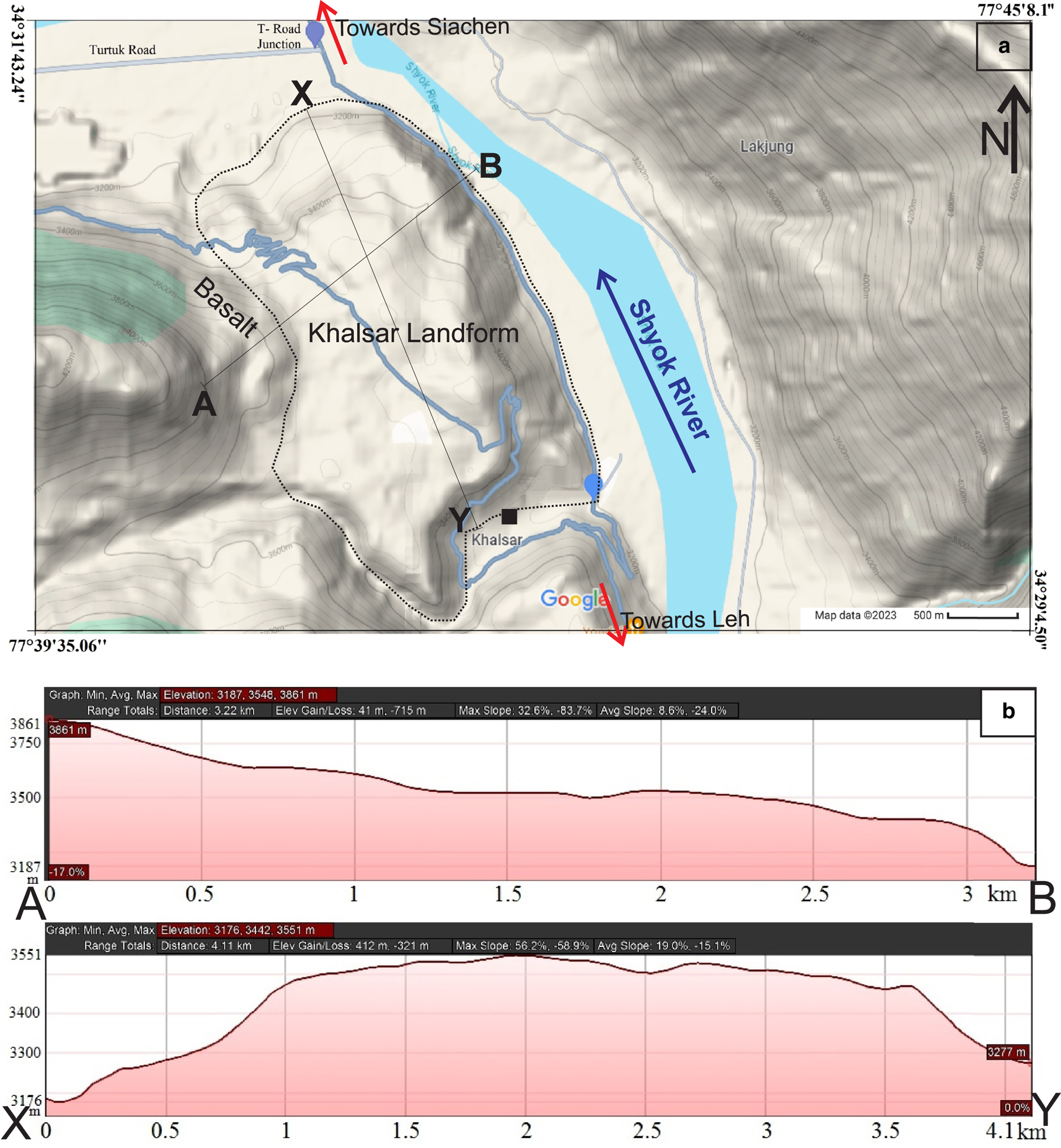 During the present study, the surface geomorphological and topographical characteristics were analysed for the entire landform. However, the detailed sedimentological and structural studies were carried out only in the northern half section of the landform towards T-road junction. The northern half section of the landform forms a vertical road cut section and exposes various lithologies and structural features in the fresh cross-sectional view of the landform, thereby making the landform suitable for sedimentological and structural studies. The thick recent scree and alluvium material covering the southern half section towards Khalsar village restricts it from detail study. Therefore, only the northern half section of the landform has been covered during the present study.