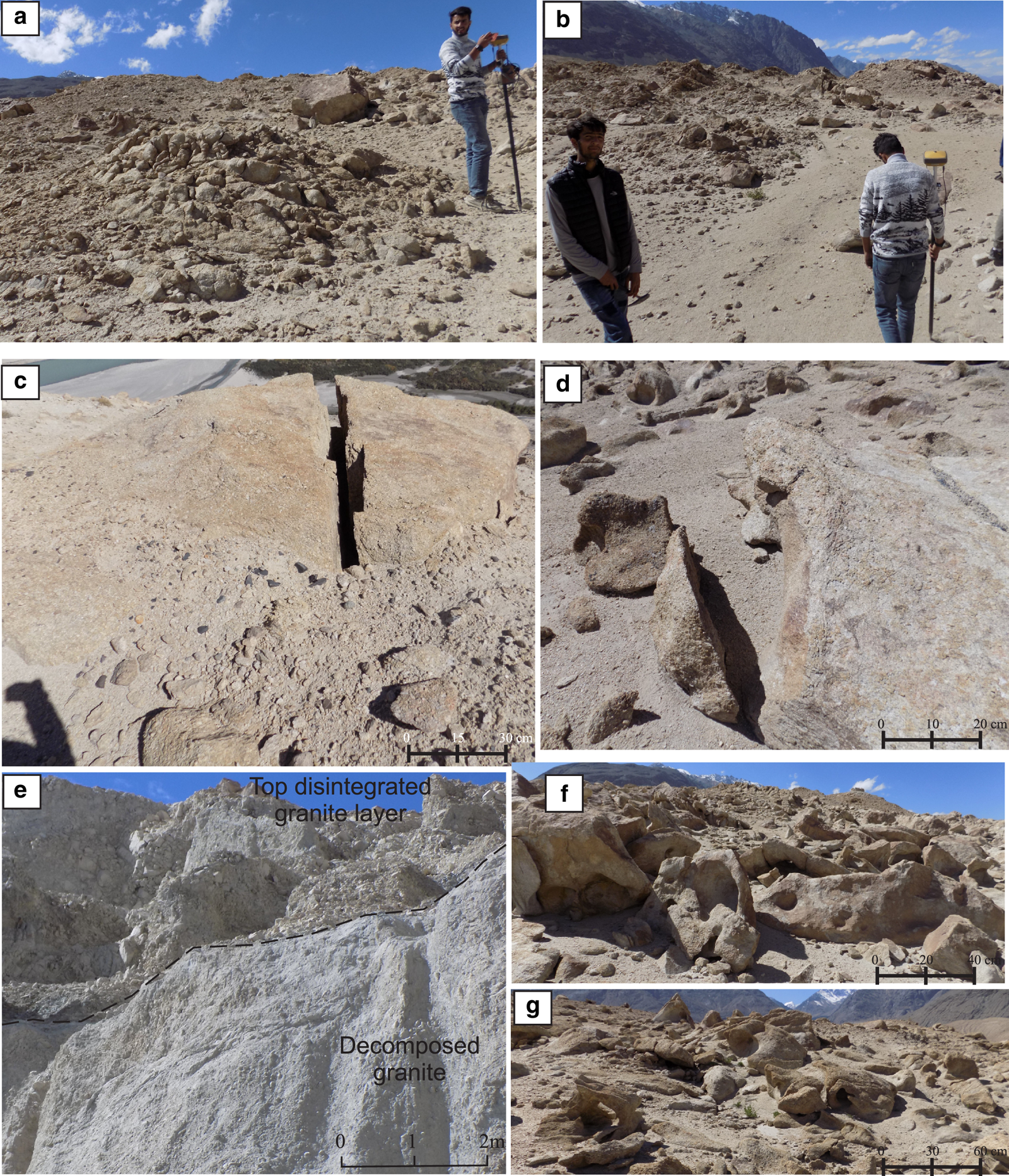 The Khalsar landform falls in an arid cold desert barren terrain between elevation ranges of 3100 and 3600 m above mean sea level, where maximum and minimum temperatures for the last 40 years varied between −10 to 15°C and −35 to −5°C (https://power.larc.nasa.gov/data-access-viewer/). The landform has an 8.2 km2 area with a maximum length of 4 km and has an average thickness of 200 m in the road cut section, and its thickness decreases to <20 m against the basalt hills on the western side (Fig. 2). The surface topography of the landform varies from slightly uneven to flat, with rolling topography at places (Figs 2, 3). The surface of the Khalsar landform shows frost shattered and weathered low-amplitude hummocky granite exposures, with widespread disintegrated boulders (Figs 3a, b). The individual hummocky bedforms are quasi-circular, with a few slightly elongated in the west-northwest direction, and are suspected to be the remnants of roche moutonnées (Figs 3a, b). The surface morphology of these disintegrated granite mounds is extensively modified by glacio-aeolian processes. The original bedrock exposures with smooth glacial surfaces are roughened by exogenic processes and are fragmented by the frost action (Figs 3c–e). The aeolian activity is shown by the features of deflation hollows and desert pavement in the disintegrated granite blocks (Figs 3e, f). The prevalence of aeolian activity and frost action reveals the cumulative role of glacio-aeolian processes in shaping the present topography of the Khalsar landform.