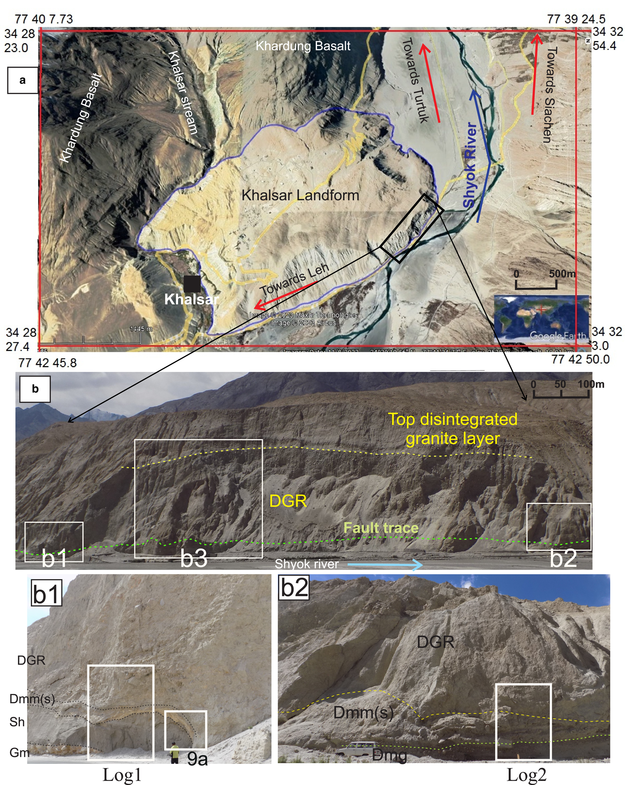 Figure 4. (a) Google Earth view of the study area (March 2023) showing the Khalsar landform. To its south Khardung Basalt of Shyok suture zone is exposed, (b) field photos of Khalsar landform show a vertical slope (cliff), with a nearly flat to very gentle top and is covered by dry ravels at slope breaks. The dashed lines separate the lowermost diamicton unit from the overlying decomposed granite by fault. The top disintegrated and grussified granite layer is also separated from the decomposed unit. (b1), (b2) and (b3) mark the sections studied. (b1) Bottom to top: Fluvial sediments of gravel bed (Gm), sand bed (Sh), massive unsorted brecciated diamicton (Dmm(s)) and decomposed granite. (b2) Bottom to top: Graded and unsorted brecciated diamicton (Dmg/Dmm(s)) and decomposed granite. (b3) Refer to Figures 8, 10 and 11.