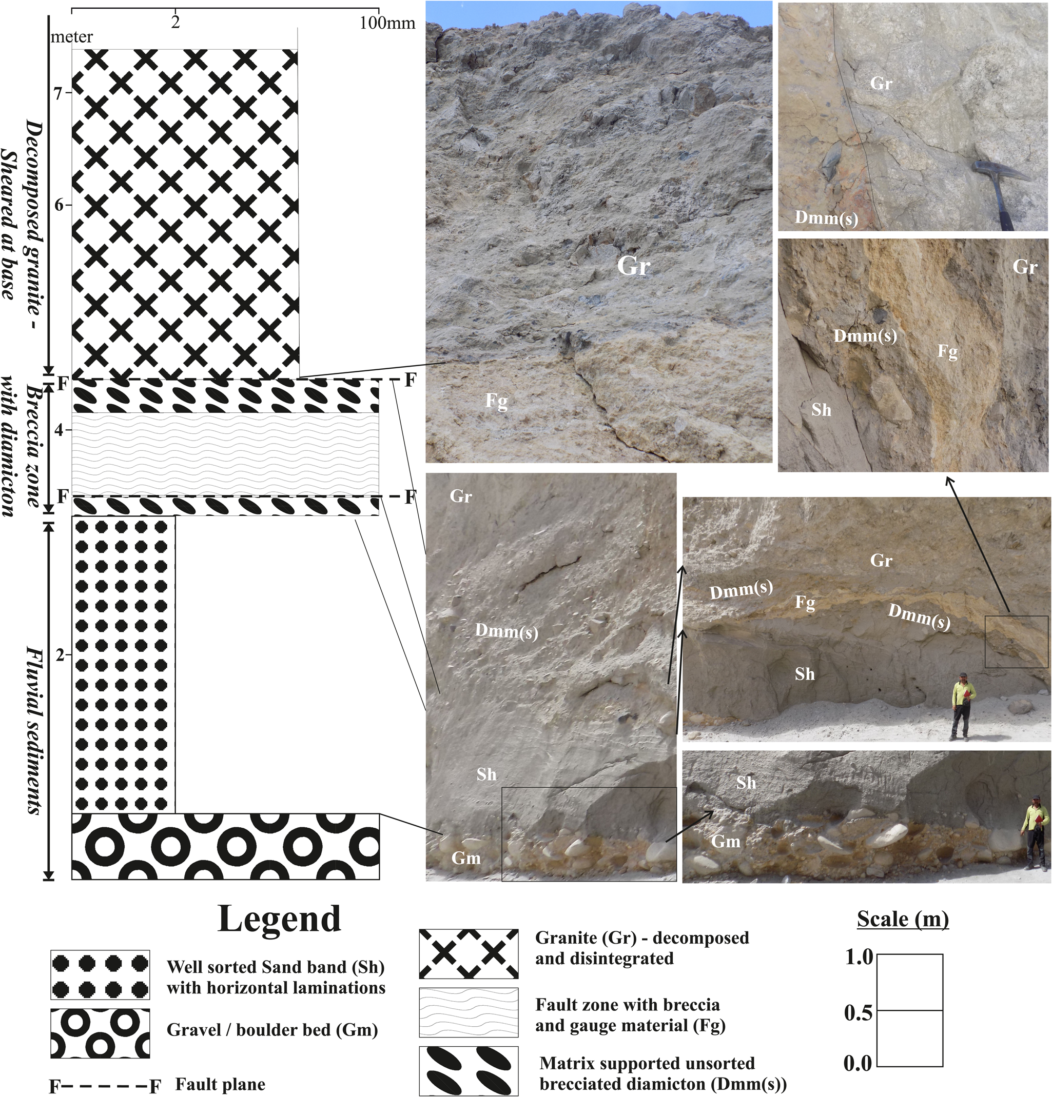 Figure 5. Lithological log-1 (refer to Fig. 4b1) showing the disposition of the various lithological units of the Khalsar landform which include Quaternary fluvial sediments (Gm/Sh), diamicton (Dmm) and granite (Gr) along with field photographs from bottom to top.