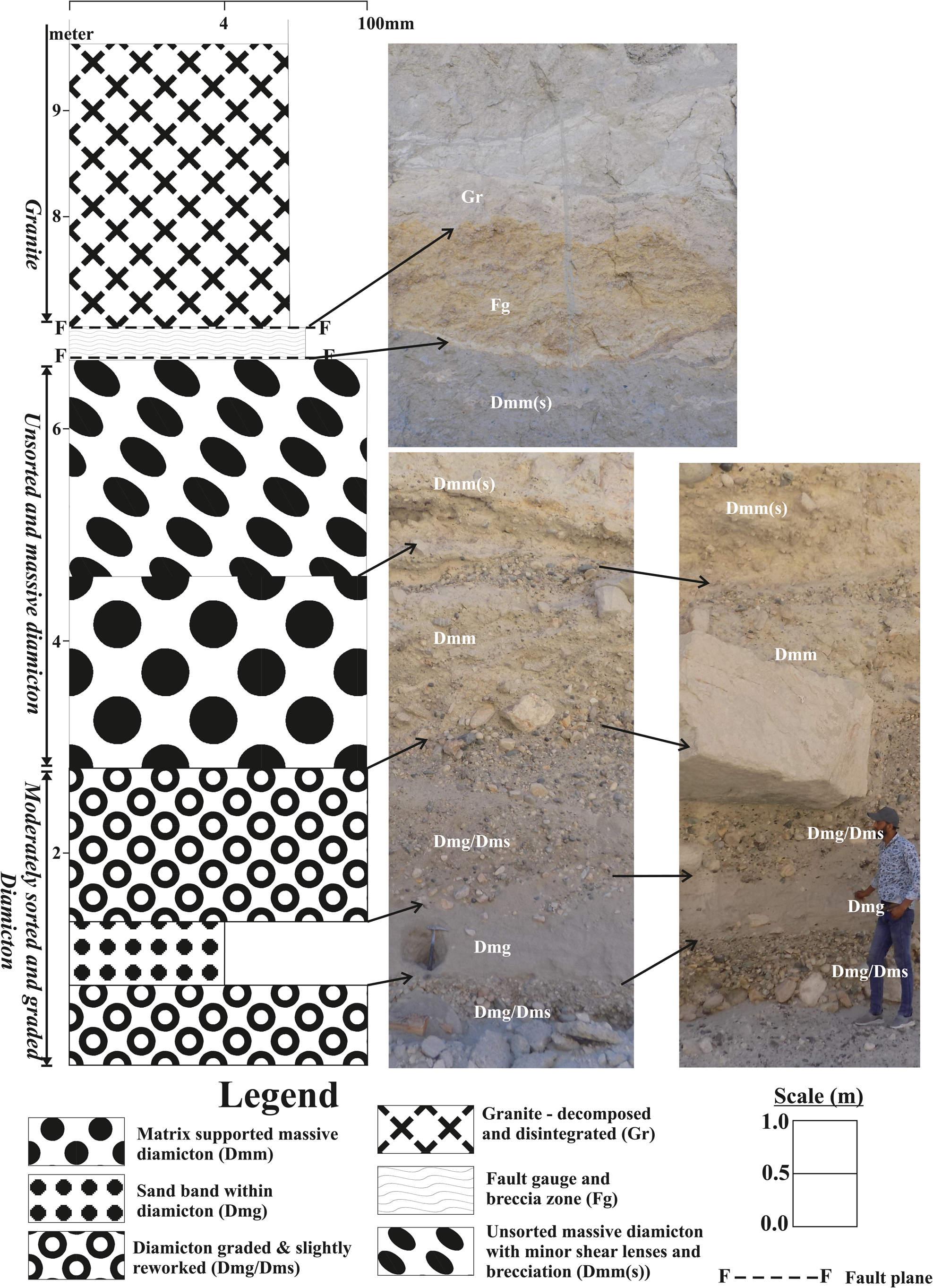 Figure 6. Lithological log-2 (refer to Fig. 4b2) showing the disposition of the various lithological units of the Khalsar landform which include Quaternary diamicton (Dmm/Dmm(s)/Dmg/Dms) and granite (Gr) along with field photographs from bottom to top.