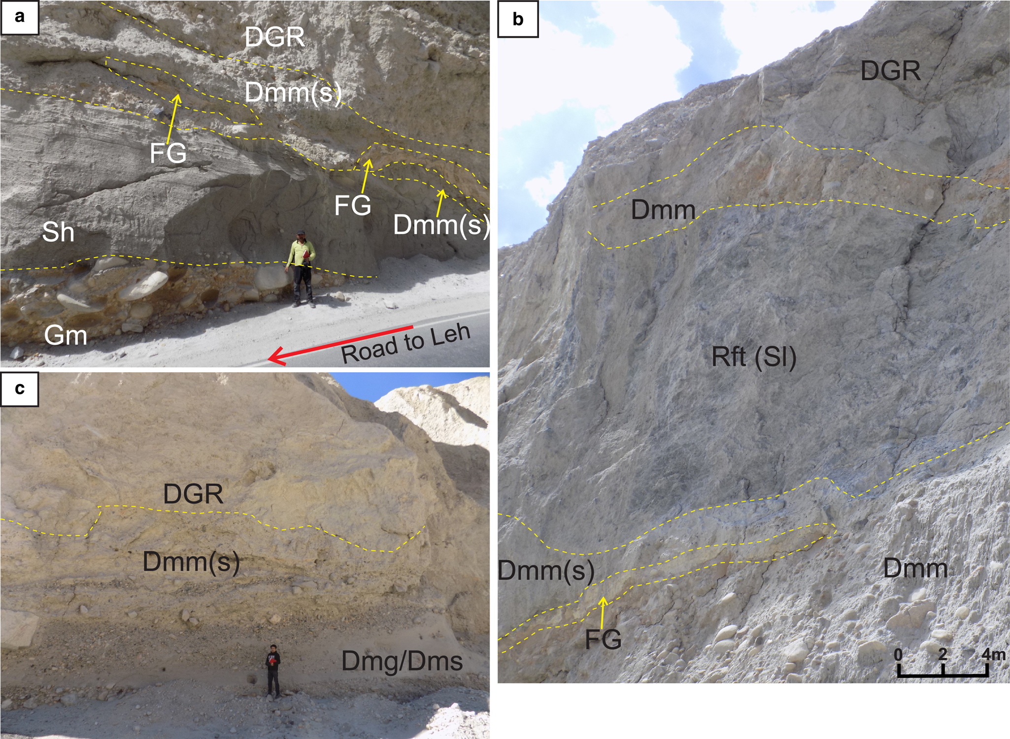 Figure 7. Field photos showing (a) undisturbed fluvial sediments of boulder (Gm) and sand (Sh) beds overlain by diamicton (Dmm(s)) along with fault gouge (FG) and decomposed granite (DGR), (b) large slate raft (Rft) within the diamicton (Dmm) with fault gouge at the base of raft and (c) decomposed granite over the disturbed diamicton (Dmm(s)) with a non-planar contact in between.