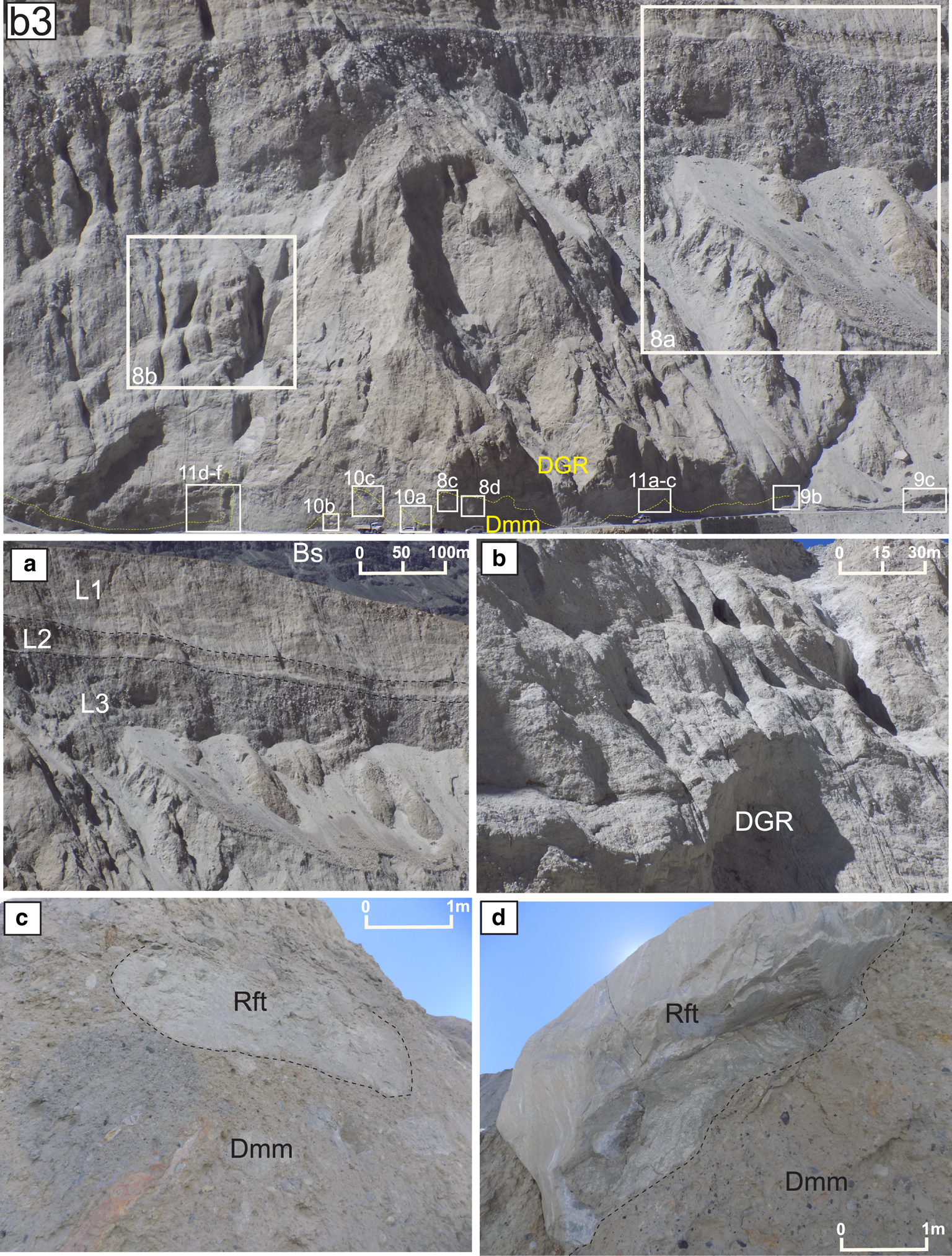 Figure 8. Field photos showing characters of Grussified, decomposed and disintegrated granite. (b3) Photomontage of decomposed and disintegrated granite at Khalsar cliff showing various glaciotectonic field features, (a) the cliff section exposes the three characteristic layers of granite exposure, L1, L2 and L3 with the bottom layer showing more decomposed character (DGR), (b) development of rills in the vertical slope of decomposed granitic indicates its highly altered nature, the granitic characters of massive to jointed nature are lacking and (c, d) large granite rafts (Rft) within the highly unsorted clay dominated diamicton (Dmm).