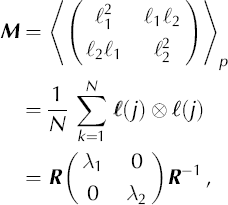 3. Reference DurandDurand and others (2004) proposed a new method based on the vectors, ℓ, that link neighbouring triple-junction locations (where three grain boundaries meet). This method, which can suffer from some artefacts in porous ice (triple junctions may occur in pores), is briefly recalled here. More details and applications can be found in Reference DurandDurand and others (2004). A local average microstructure anisotropy tensor, M, can be defined as: (4) where (ℓ1, ℓ2 ) are the coordinates of ℓ in the local reference frame, R, (the ē3 axis is perpendicular to the thin section). The absolute horizontal orientation is unknown; ē1 is relative to the thin section, which cannot be oriented with respect to the core axis. R is the rotation which makes M diagonal and (λ1, λ2) are the corresponding eigenvalues; (·)p denotes the average over N vectors, up to the pth neighbours. A sample can be examined under different scales: a small p explores details, whereas a larger p improves the statistics. Compared to the inertia tensor presented in Equation (2), M has the additional advantage that it has a physical significance in terms of mechanical deformation (Reference Aubouy, Jiang, Glazier and GranerAubouy and others, 2003). From the variation of M with respect to a reference M 0, a statistical strain tensor, U, which coincides with the classical definition of strain (Reference Aubouy, Jiang, Glazier and GranerAubouy and others, 2003), can be defined. As M 0 cannot be measured for natural ice, Reference DurandDurand and others (2004) assume that the deformation is isochoric, and that the reference state is isotropic, leading to the following expression: (5) Note that some statistical tests, comparable to those presented in section 3.1.2, have been carried out to estimate the intrinsic variability of U that leads to ω(U) = 0.35N–1/2 (Reference DurandDurand and others, 2004).