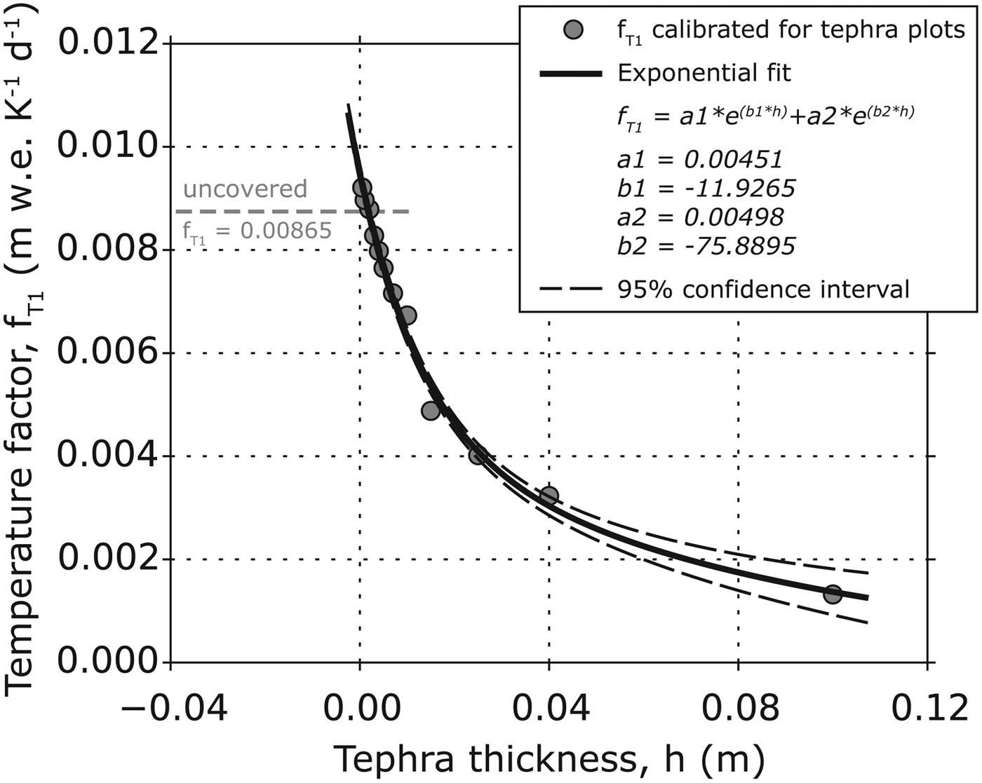 The empirical parameters of this function (a 1, b 1, a 2, b 2) were calibrated using least-squares fitting (Fig. 4). In the fitting procedure, only plots with given tephra cover are considered. The temperature factor of the uncovered bare-ice plot is calibrated independently. It corresponds to a degree-day factor for glacier-ice surfaces.