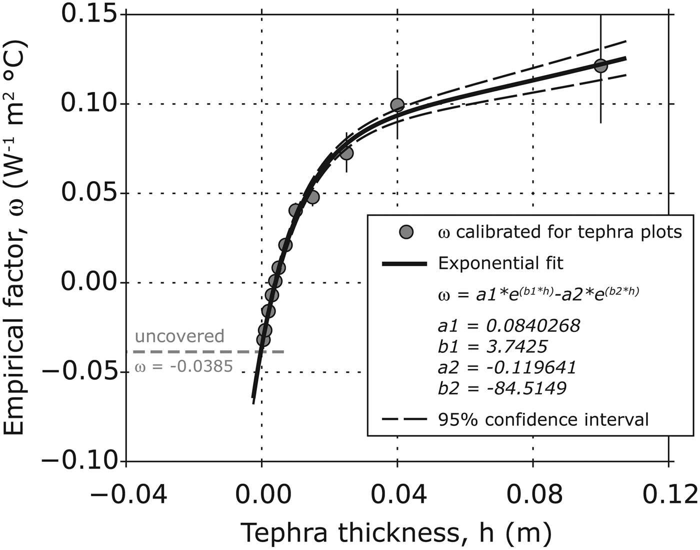 This formulation uses the air temperature as a first approximation of the tephra surface temperature and corrects it by a radiation-based term that varies with tephra thickness. This variability is expressed by the empirical factor ω. It is calibrated as an exponential function of tephra thickness (Fig. 6) using least-squares fitting according to:
