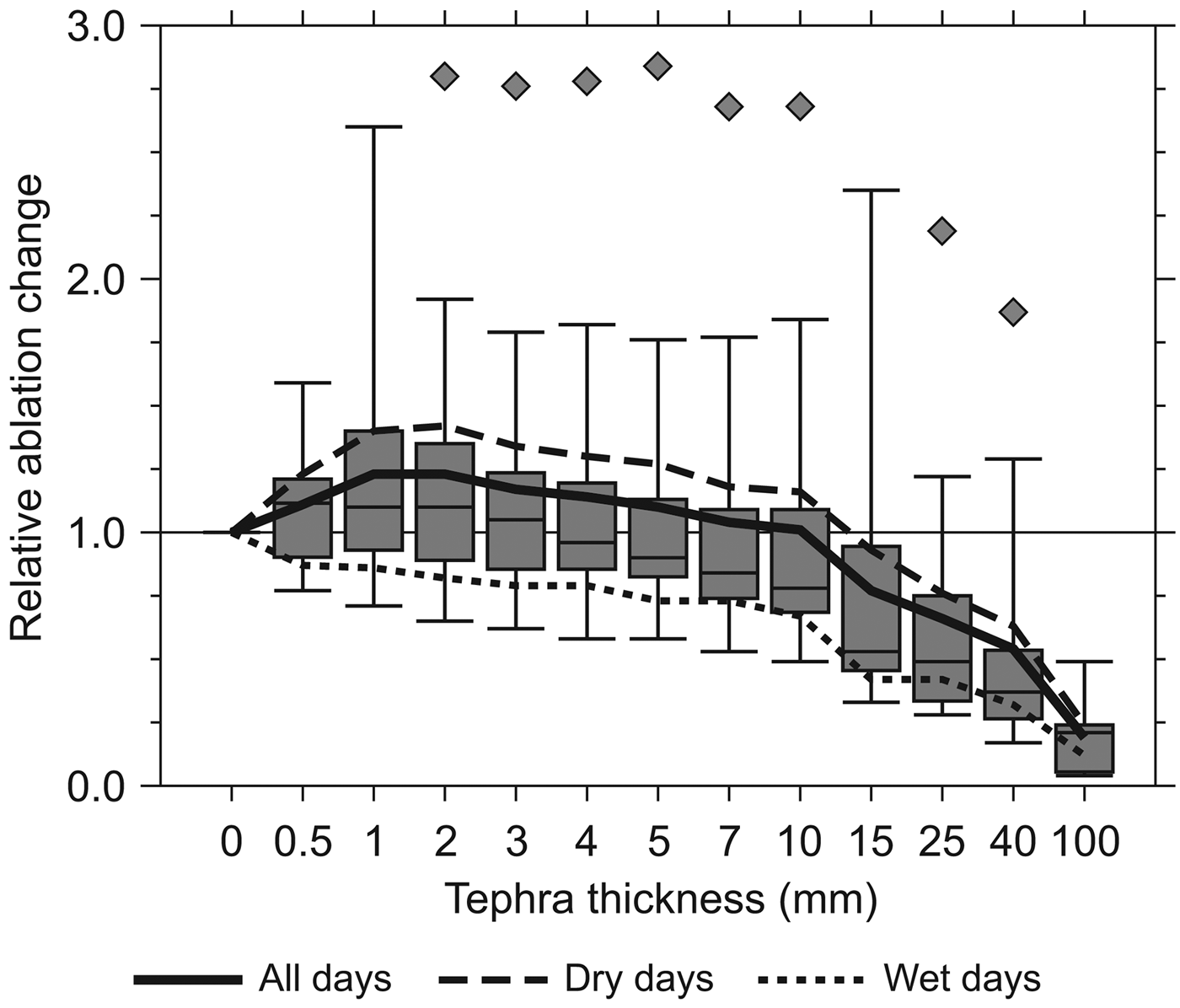 All of these studies rely on natural tephra covers with the variability of thicknesses being determined by the deposition processes. Only a recent study by Dragosics and other (Reference Dragosics2016), which investigated the influences of ash from the 2010 Eyjafjallajökull eruption on ice ablation in a laboratory experiment, is based on preselected deposition thicknesses. The latter has the advantage that thicknesses can be chosen such that they facilitate a better model fitting. This means using a higher frequency of different thicknesses in the lower-millimetre scale, where substantial variability in tephra-induced ablation changes can be expected.