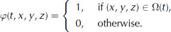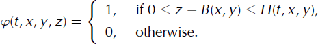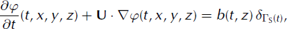 is the three-dimensional Dirac delta function on the surface ΓS(t). Since φ(t, x ,y, z) is discontinous at ΓS(t) U ΓB, its derivatives with respect to time and space in Equation (14) must be understood in a weak sense. (Refer to appendix A of Reference Cottet and KoumoutsakosCottet and Koumoutsakos (2000) for a precise mathematical definition of weak derivatives and weak solutions for transport problems.)