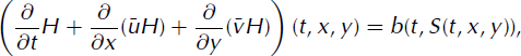 The thickness of the ice is given by H(t, x, y) = S(t, x, y) − B(x, y), where S and B are the elevations of the ice surface and bed, respectively. The mass balance of a vertical column (Reference Picasso, Rappaz, Reist, Funk and BlatterPicasso and others, 2004; Reference Deponti, Pennati, de Biase, Maggi and BertaDeponti and others, 2006) yields the Saint-Venant equation,