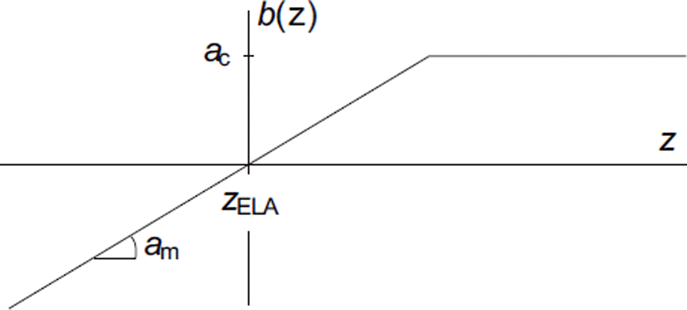 The mass-balance distribution on a glacier surface is influenced by precipitation and melt patterns, which, in turn, are influenced by topography, wind patterns and perhaps debris coverage. Despite these complications, the mass balance, b(z), is predominantly elevation-dependent. To reduce the number of degrees of freedom in a possible mass-balance parameterization, a simple distribution is defined by the melt gradient, a m, the equilibrium-line altitude, z ELA, and the maximum accumulation rate, a c (Fig. 10):