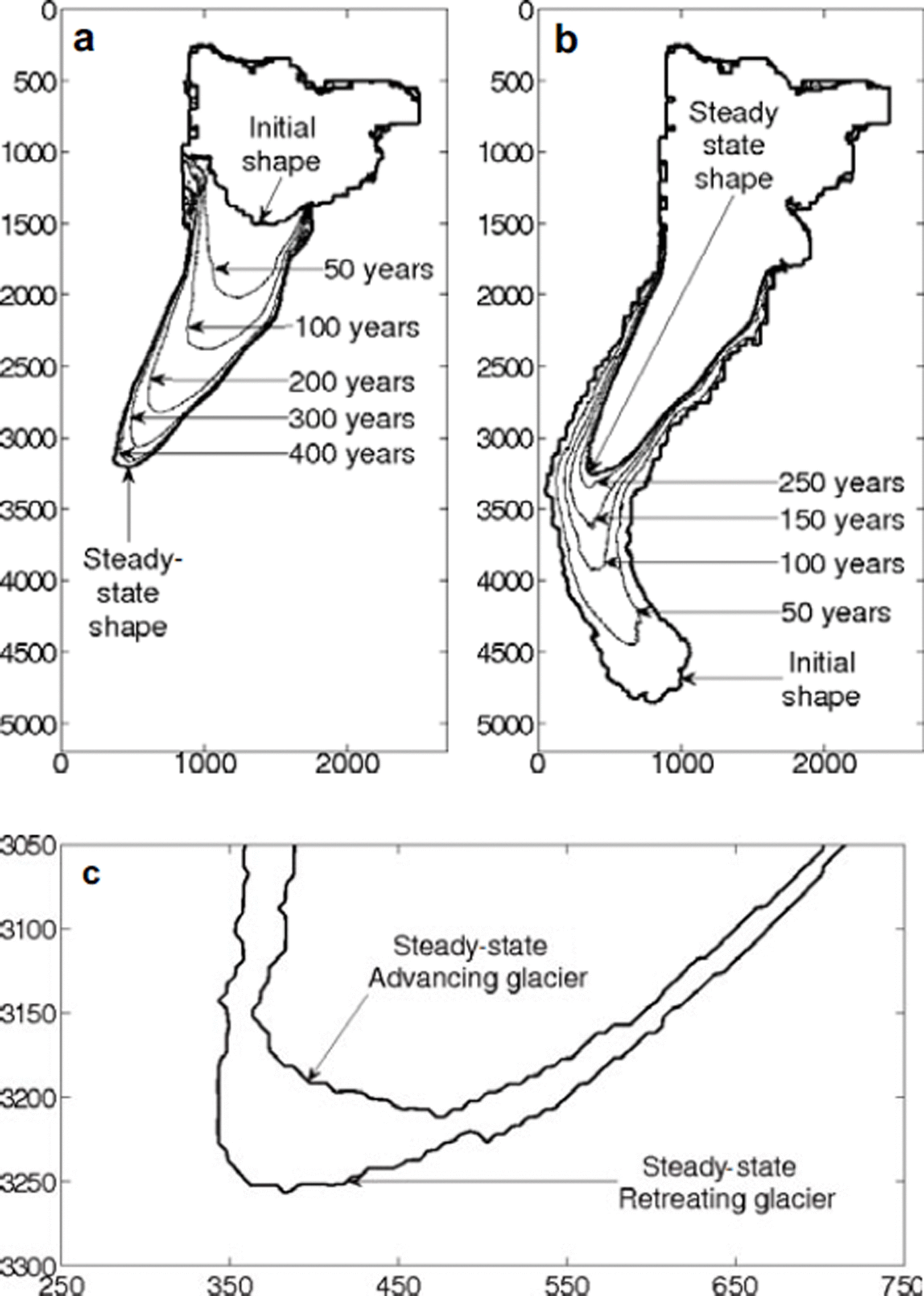 Fig. 11. Evolution of the glacier starting from (a) the Little Ice Age position and (b) the Punt Muragl position. The parameter values for the steady state corresponding approximately to the Margun position are z ELA = 2700 m a.s.l., a c = 0.5 m a−1 and a m = 0.004 a−1. (c) The difference between the locations of the two tongues. Axis labels are in meters.