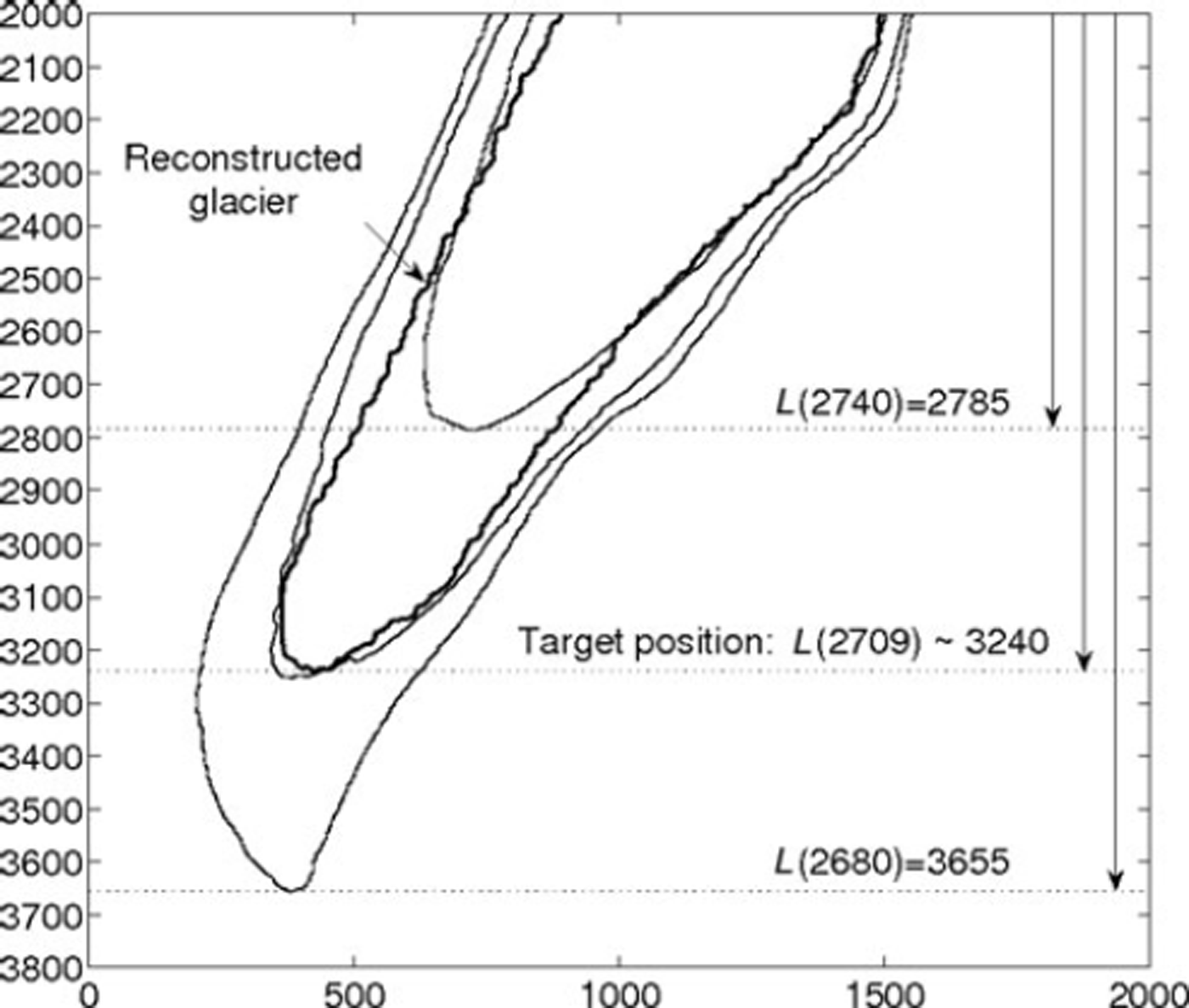Fig. 12. Computation of steady shapes for z ELA = 2740 and 2680 m a.s.l. provides two abscissas for the tongue’s end: L(2740) = 2785 and L(2680) = 3655. Using a secant method, z ELA = 2709 m a.s.l. is a judicious choice for the next computation. Indeed, the corresponding steady shape almost fits the target position. Figure 14 shows that the target’s position is a linear zone of the function L(z ELA). This justifies the efficiency of the method in this case. Axis labels are in meters.