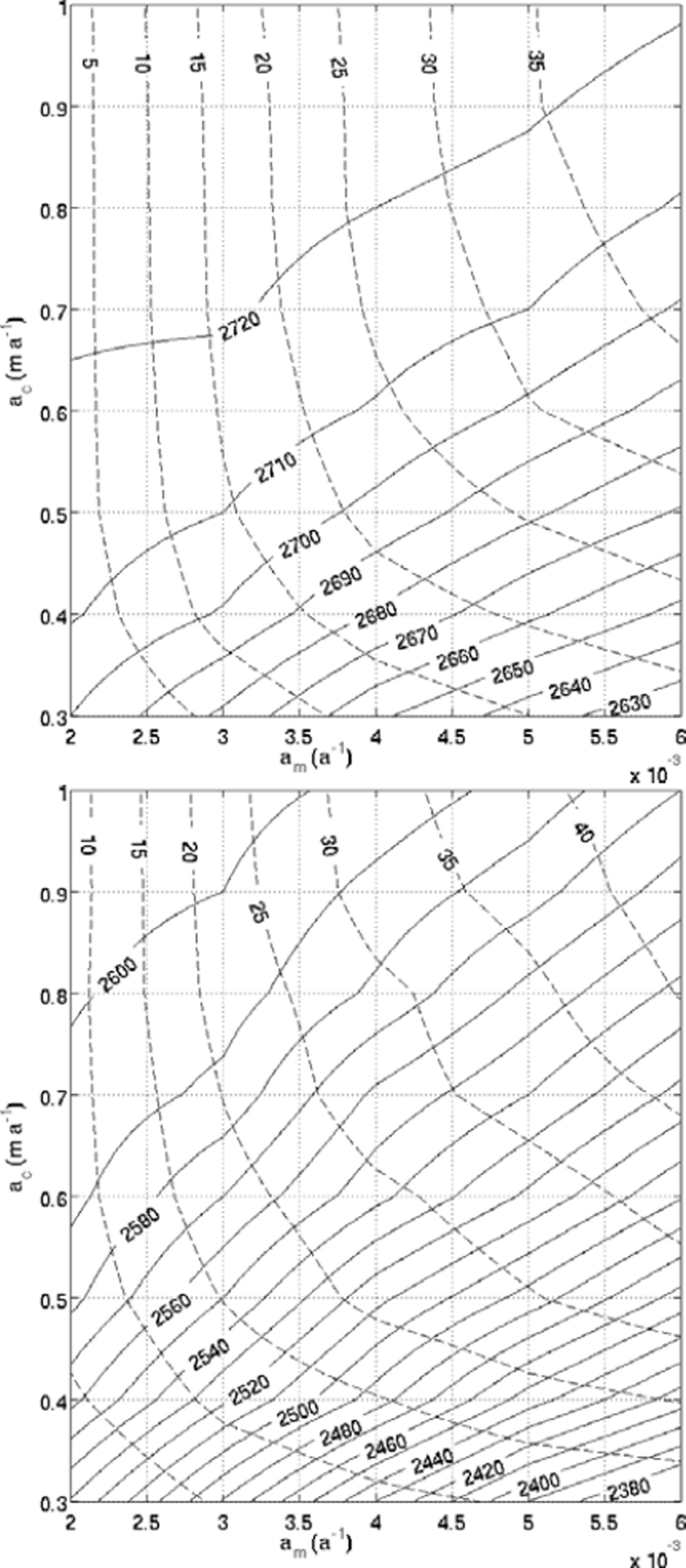 Fig. 13. The level sets of z ELA with respect to a m and a c (solid curves) and variation of the volume (in %) of the steady shapes are given relative to the smallest value, obtained with the smallest coefficients a m = 0.002 m a−1 and a c = 0.3 a−1. (a) Margun position; (b) Punt Muragl position.