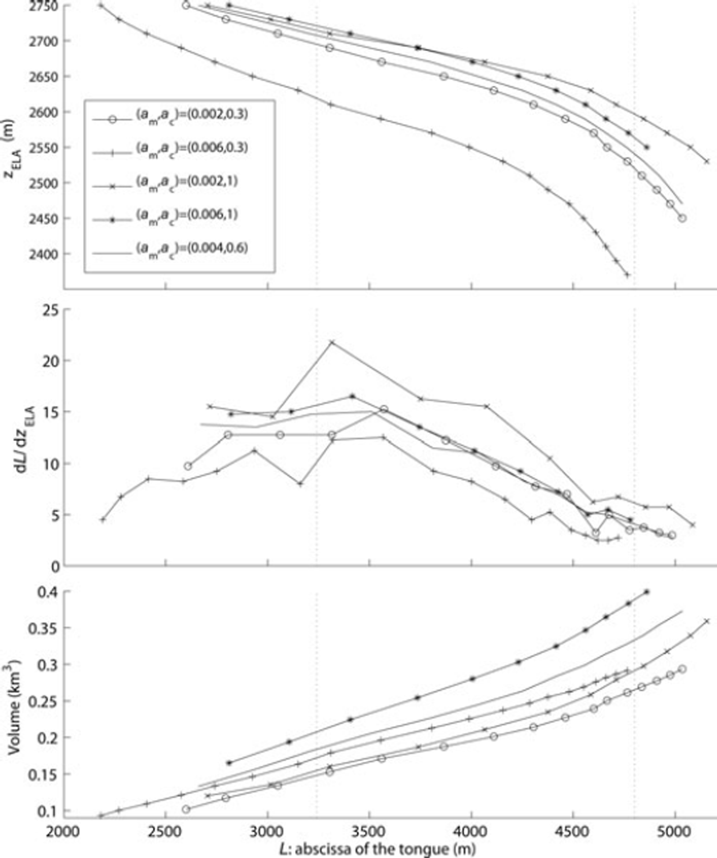 Fig. 14. (a) Equilibrium-line altitude, z ELA, (b) climate sensitivity, dL/dz ELA, and (c) volume, as a function of the equilibrium length for four extreme cases (a m = (0.002, 0.006) a−1 and a c = (0.3, 1.0) m a−1) and an intermediate case (a m = 0.004 a−1 and a c = 0.6 m a−1). Margun and Punt Muragl positions are indicated by dotted curves.
