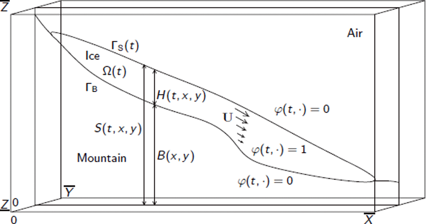 Let Ω(0) be the initial domain of the glacier and φ(0, x, y, z) be the corresponding VOF deduced using Equation (10), then the problem is to find a set of (φ, U, p) that satisfies the advection problem, Equation (14), and the elliptic problem, Equations (3–7), with the initial condition φ(0, x, y, z).