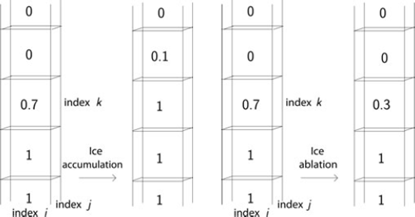 Let b(t, x, y, z) be the thickness of a layer of ice added (accumulation) or removed (ablation) during a given time-step. This function may depend on the position, (x, y, z), and time, t. However, in all examples presented in this paper, it is assumed to be only a function of the altitude, z = z(x, y), of the ice surface (b = b(t, z) in what follows).