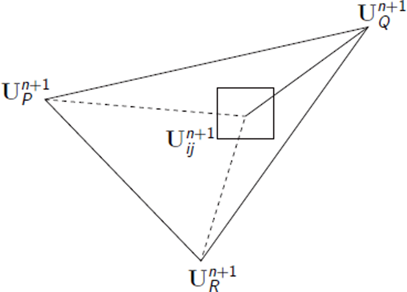 is defined using the values of U at vertices P, Q and R of the element containing the cell (ij).