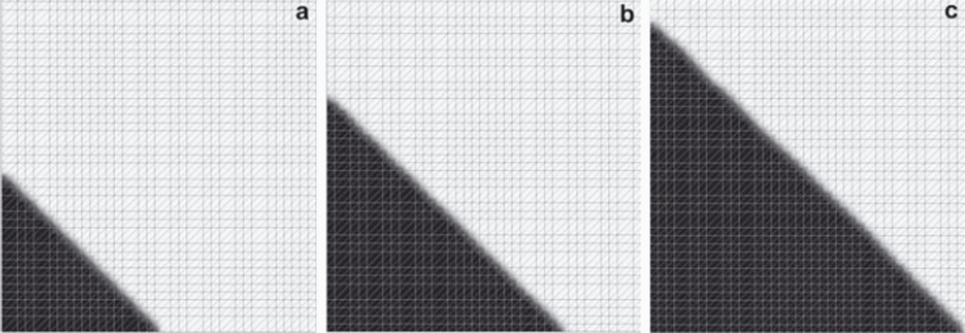 Fig. 8. Evolution of the interface in the test case for the two-dimensional transport algorithm. (a) t = 0, (b) t = 0.5 and (c) t = 1 year.