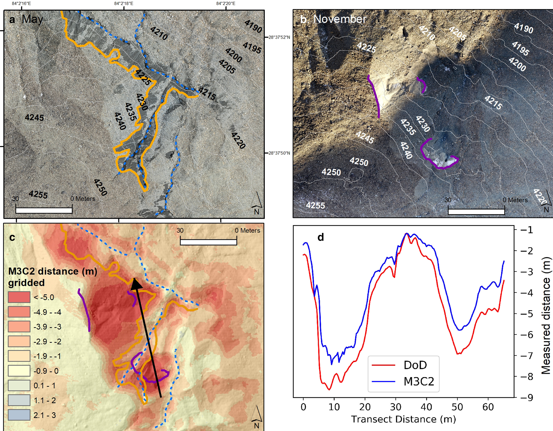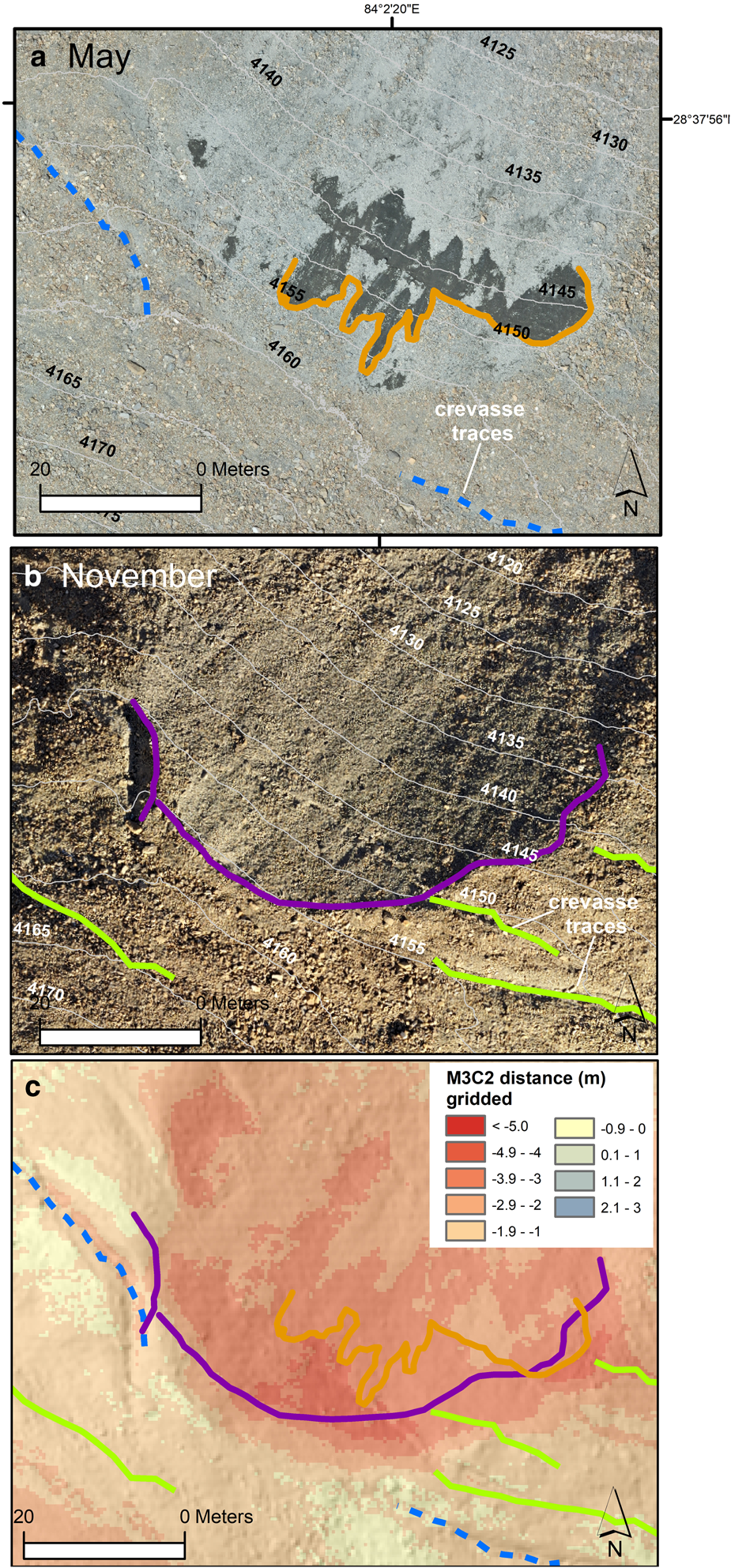 Domain ‘d’ was an area of dramatic surface change (Fig. 11) that was not obvious from the point cloud differencing before the flow-correction (Fig. 6a). In this area, a patchy ice cliff was evident in May 2019, but had disappeared entirely by November. This ice cliff occupied a shallow surface recession, which had moderate surface slopes (20–25°) and a lighter, grayer debris appearance than its surrounds in the May orthomosaic, characteristic of recent debris reworking. This area experienced moderately higher melt distances (>2 m) than the survey area average (0.85 m), suggestive of thinner debris coverage. We also note that surrounding this recessed area are several linear surface features running perpendicular to the surface slope and the direction of glacier flow, which we interpret as buried crevasses; these features also correspond to higher M3C2 distances.