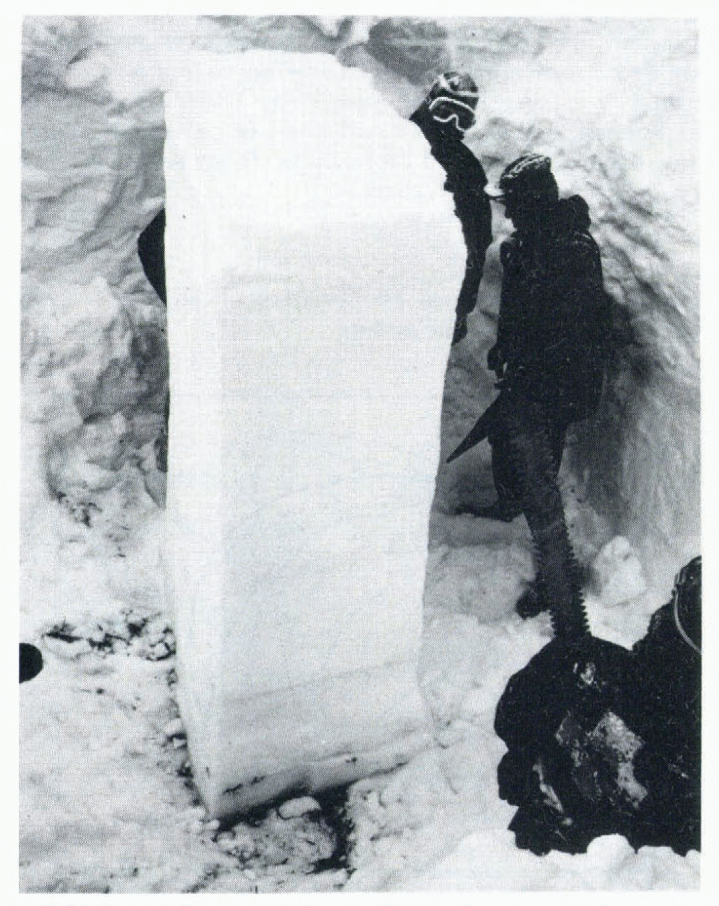 One of the most useful experiments during the field phase of this course follows a procedure suggested by E. R. LaChapelle and developed by C. C. Bradley for testing the snow resisto- graph (Reference BradleyBradley, 1968). The procedure was designed to gain confidence in obtaining the ratio of snow strength to snow load above the weakest layer in a mature snow-pack as measured by Figure 1 the snow resistograph (Reference Bradley and BowlesBradley and Bowles, 1967), Students can determine the profile for compressive strength of the snow column using either the resistograph or the ram penetro- meter. Following this, the load above the indicated weak layer is determined by means of the Mount Rose snow sampler. The research team then isolates a column of snow 1 m square using shovels (Fig. 1). The predetermined weak layer is located in the column and undercut by sawing from two sides on the column toward its center. (A crude large-toothed home-made wooden saw is used for this.)
