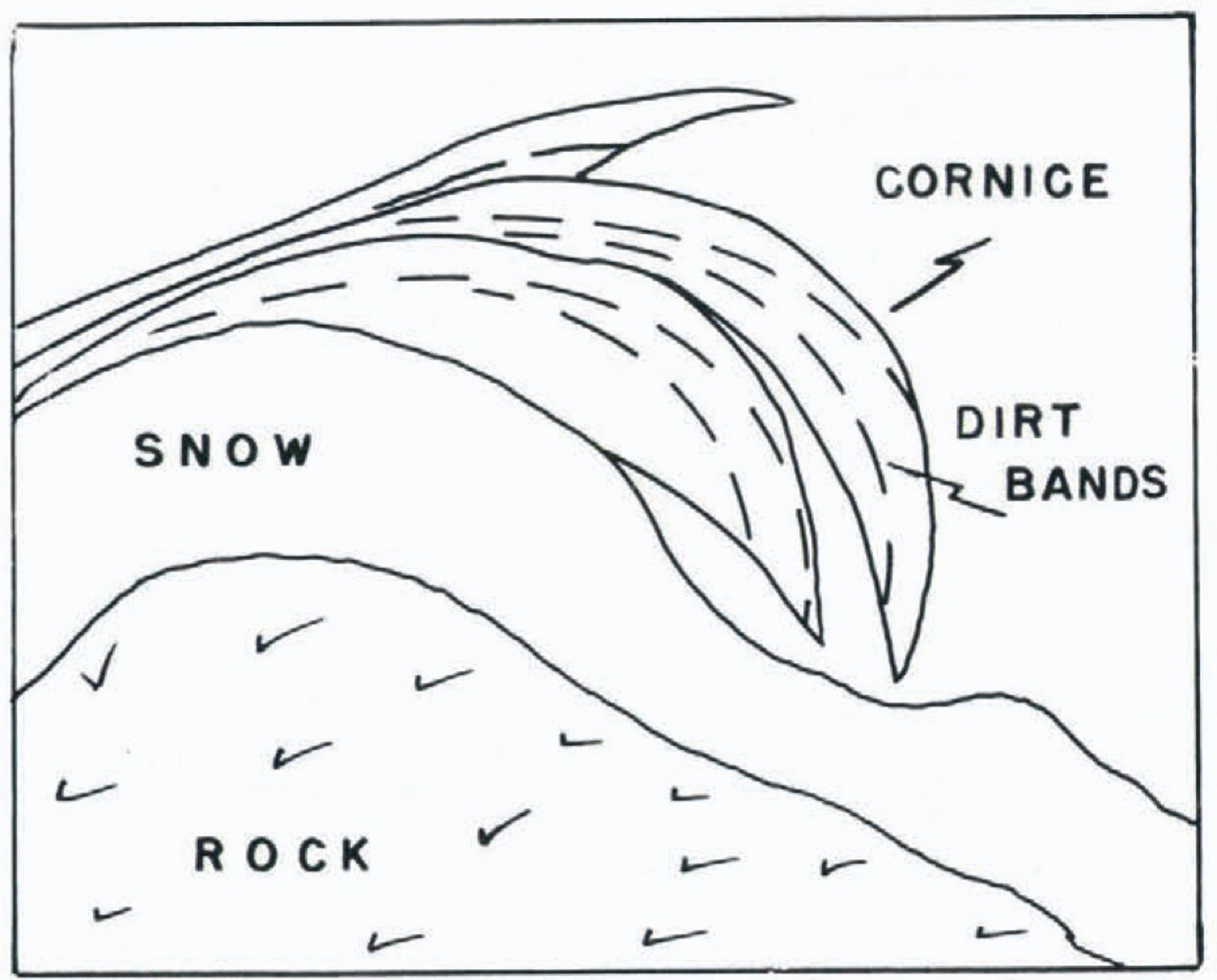 Dirt bands and textural changes in the snow can be used to demonstrate the history of snow deformation and cornice accretion (Fig. 2) in transects perpendicular to the long side of a cornice. Dirt bands tend to diverge towards the leading edge of the deformed cornice wedge, indicating that cornice accretion is accompanied by continual down bending, and that hollows can be perpetuated within the leeward areas of cornices as each successive cornice wedge bends downwards. Stakes planted vertically in the growing cornice wedge tend to lean down-hill in time as a result of this distortion.