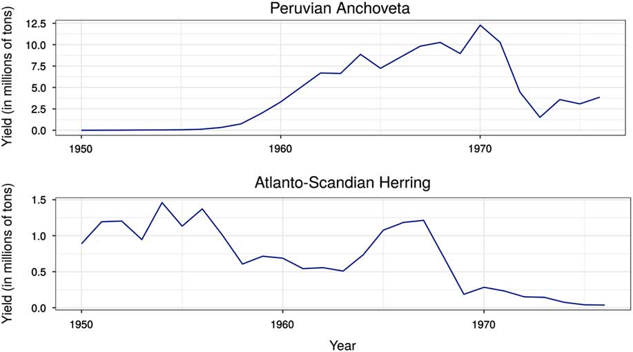 The Peruvian anchoveta and Atlanto-Scandian herring are both pelagic fisheries, where industrial production was mainly geared to the reduction of raw material into fishmeal and fish oil. These products, intended for livestock rather than human consumption, were sold globally; thus these two fisheries were directly connected and competed with each other on global commodities markets. Indeed, while the scales of the collapses differed, on paper the abrupt decline in yields look somewhat similar (see Figure 2). However, varying local politico-economic contexts and environmental conditions led to vastly different social and economic experiences of collapse.