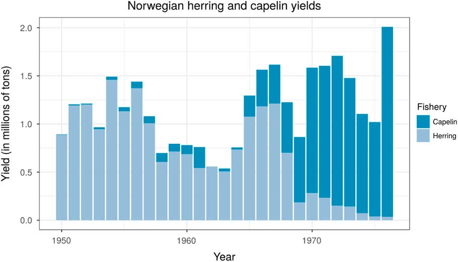 Figure 4 The switch from herring to capelin in Norway. Source: Norwegian Statistical Bureau, http://www.ssb.no/a/histstat/statbank-histu.html.