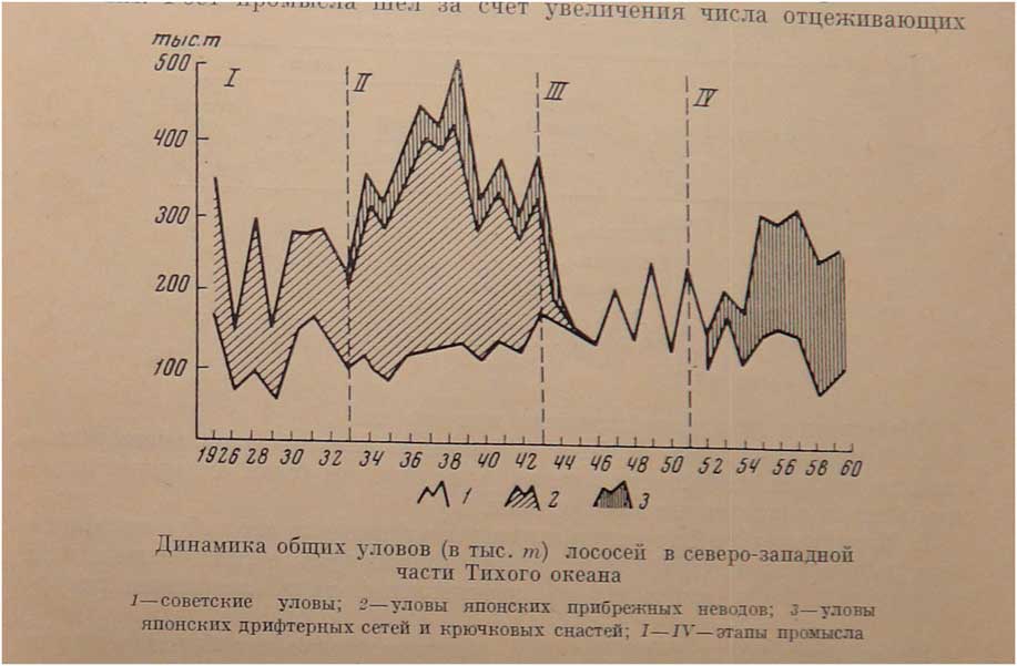In 1952, the USSR Council of Ministers issued a decree ordering the federal Academy of Sciences and the Ministry of Fisheries to conduct joint research to better understand the causes of fluctuating salmon yields in the Soviet Far East. Representatives of these two organs in 1954 found primarily climatic factors and Soviet fishing and forestry (owing to timber floats in salmon spawning grounds) responsible for variations and declines. Just two years later, however, the focus of Soviet opprobrium for poor salmon yields had shifted dramatically from the Soviet timber industry to ‘predatory’ Japanese fishing. Following the San Francisco Peace Treaty and their subsequent exclusion from North American salmon fisheries, Japanese fishers had looked increasingly to Soviet waters, where Japanese fishing had a long history.Footnote 63 The return of Japanese fishing vessels to the waters off Kamchatka, home to the large majority of Far Eastern salmon, was viewed by Soviet fisheries officials with extreme trepidation.Footnote 64 This was a difficult period in Soviet–Japanese relations in general, particularly because of the issue of the Kuril Islands, which the Japanese government considered, and still considers, Japanese territory.Footnote 65