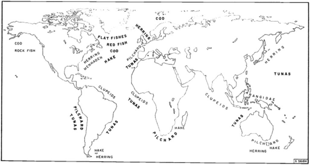 Figure 7 The fisheries (in bold) that were held to be underexploited in 1949 that, by 1967, experts at the FAO believed were in need of management. Source: FAO, State of food and agriculture, p. 120.