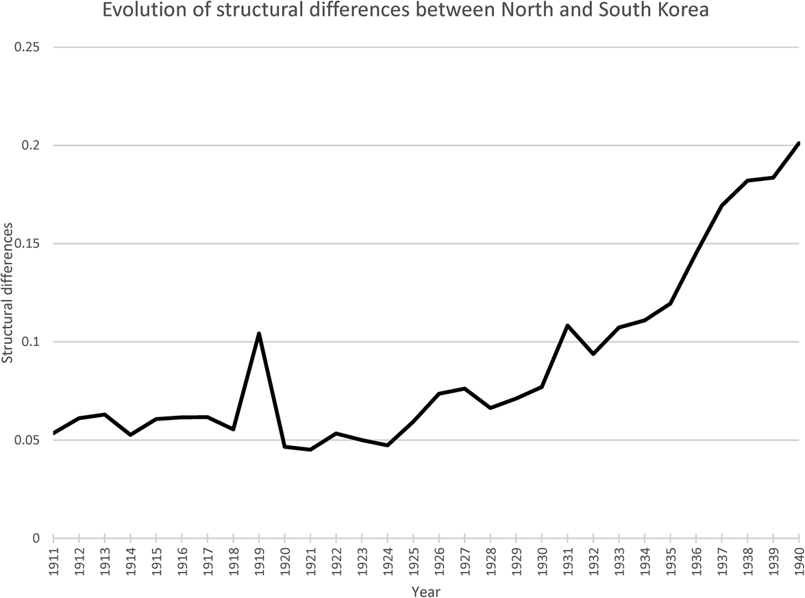 In order to observe the differences in the structure of economic activity and evolution of these differences between North and South Korea under the Japanese rule, we employ the methodology of assessing the sectoral similarities developed by Sun and Ng (Reference Sun and Ng2000). This methodology compares the relative participation of sectors in an economy, and allows temporal tracking of the similarities between sectoral compositions of regions that would later become constituting parts of North or South Korea, respectively. The importance of location and regional variation, particularly through the processes of economic transformation, has a long-standing tradition in economic analysis (e.g. Hoover and Fisher, Reference Hoover and Fisher1949; North, Reference North1955; Ohlin, Reference Ohlin1935). And it has become particularly relevant for the study of present-day emerging economies (Arora and Anand, Reference Arora and Anand2021, for India; Nguyen, Reference Nguyen2020, on Vietnam). For our case, at the beginning of the observational period (1911) results obtained from the measurement developed by Sun and Ng (Reference Sun and Ng2000) show small differences in the structures of economic activity between North and South Korea. The sectoral differences calibrated are fairly stable prior to 1924. From 1924 on, sectoral differences between regions that would become North or South Korea, respectively, begin to increase rapidly and this trend of widening differences does not change until the end of the observational period (1940). These changes coincide with greater Japanese imperial expansion and may be a potential cause of observed diverging economic activities and performance of different regions on the Korean peninsula (see Cha, Reference Cha, Latham and Kawakatsu2000; Francks et al., Reference Francks, J. and C.H.1999; Gradjanzev, Reference Gradjanzev1944).