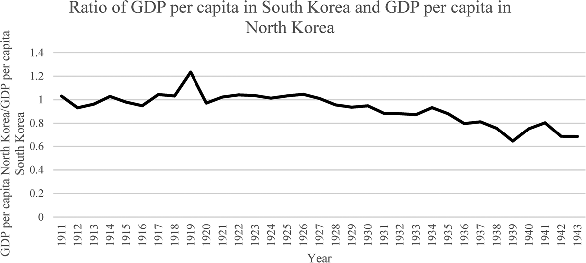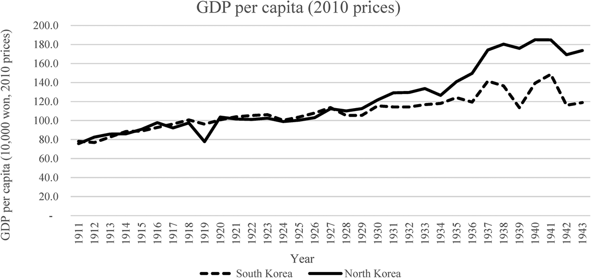 The second part of the study will comparatively analyse economic activity and economic performance of the northern and southern regions. The differences in economic performances of northern and southern Korean regions from 1911 to 1943 are measured by GDP per capita in 2010 prices. The study finds that for some time, beginning in the mid-1920s, northern Korea's (hereinafter ‘North Korea’) GDP per capita was increasingly higher than southern Korea's (hereinafter ‘South Korea’). By 1940, the difference in per-capita GDP between North and South Korea was large enough to justify the notion that the two areas constituted distinct economic entities.