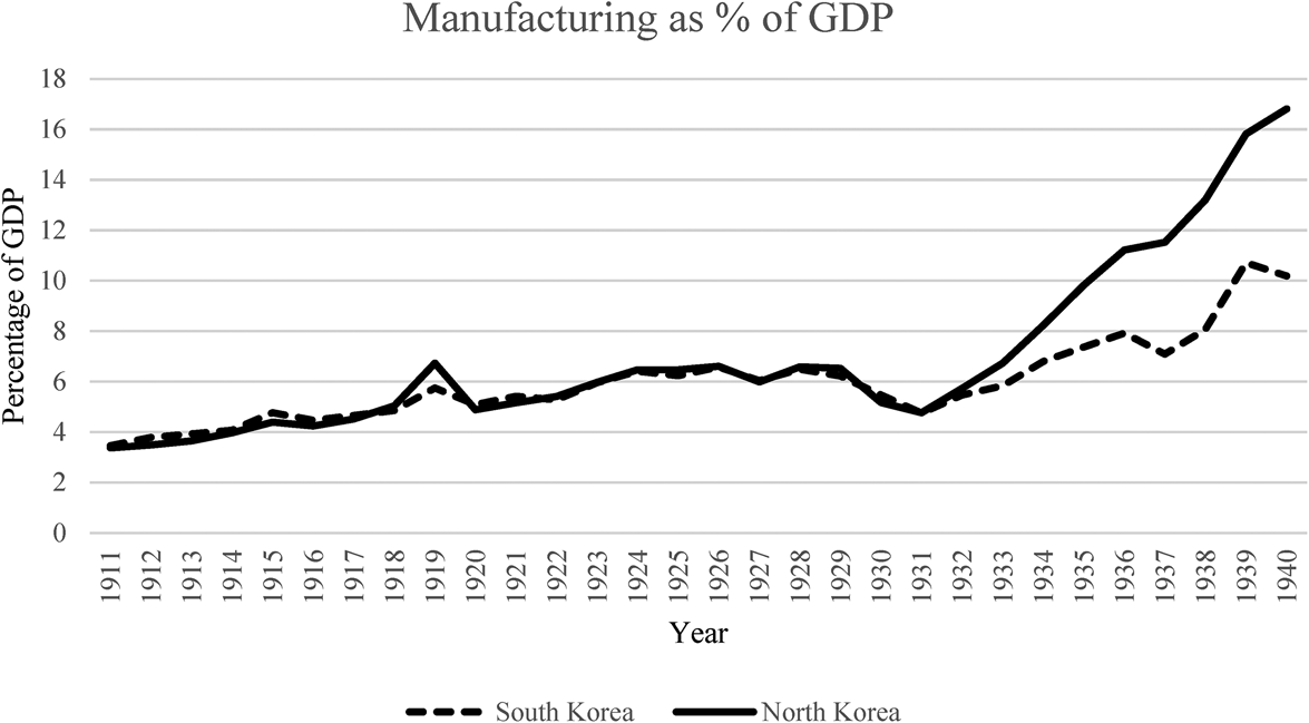 Similarly, prior to the 1930s, the manufacturing sector's contribution to GDP was almost the same for both Koreas. From 1931, North Korean manufacturing began to participate relatively more in GDP, and this participation growth was faster than in South Korea. In 1940, share of manufacturing in total GDP was almost 17% in North Korea; in South Korea it was around 10%. These findings corroborate the development of a dual economy in colonial Korea (Suh, Reference Suh1978).