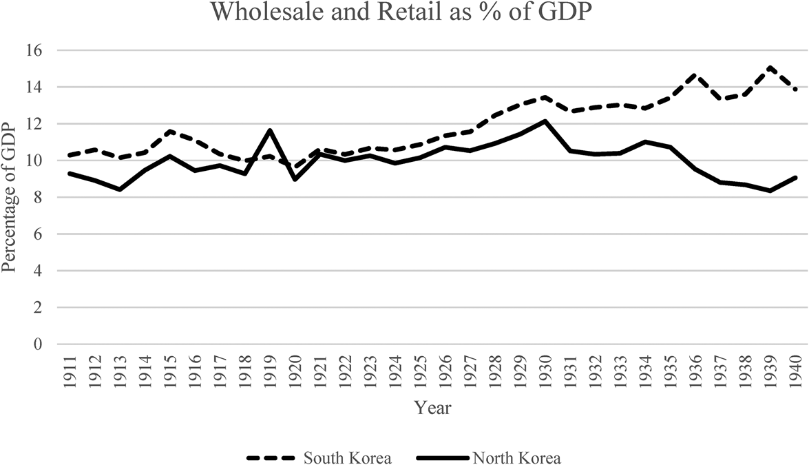 Wholesale and retail participation in GDP was also fairly similar in both Koreas until the 1930s. Prior to the 1930s, the wholesale and retail share in GDP was slightly lower in North Korea compared to South Korea, with an average difference between of less than 1%. Beginning in the 1930s, GDP shares of wholesale and retail declined in North Korea and grew in South Korea, deepening the difference in this sectoral participation.
