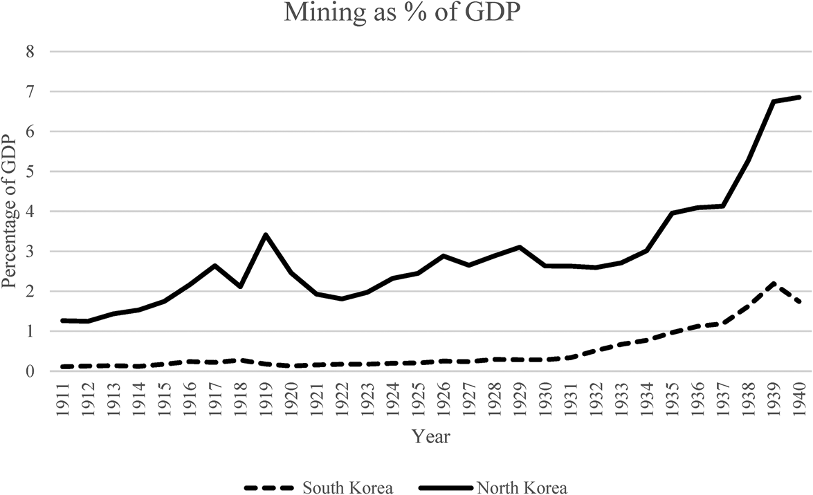 Participation of mining in GDP in North Korea was consistently higher compared to South Korea. In 1940, share of mining as a percentage of GDP in North Korea was around 7%, and slightly above 1.5% in South Korea.
