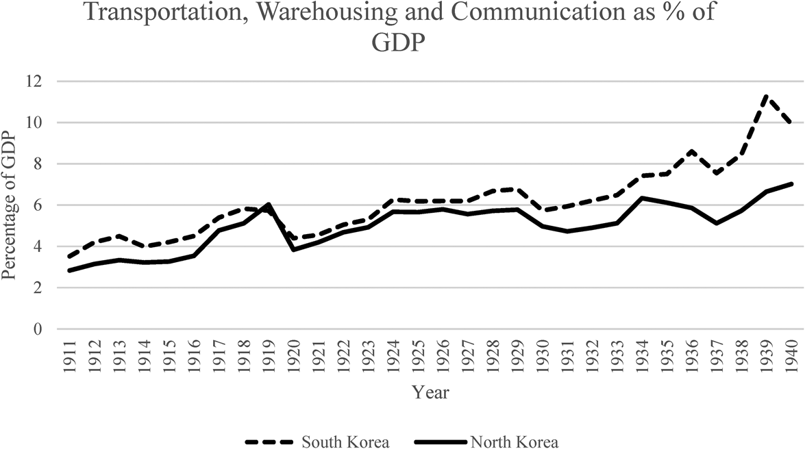 Figure 8. Transportation, warehousing and communication in North and South Korea from 1911 to 1940 (base price 1935).