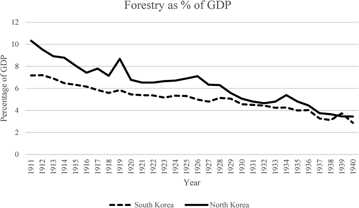 Forestry as a percentage of GDP was declining in both North Korea and South Korea from 1911 to 1940. Nevertheless, the GDP participation of forestry was declining much faster in North Korea than in South Korea, with its most rapid decline from 1925 to 1931. At the beginning of the observational period, the participation of forestry in North Korea's GDP was more than 3% greater than in South Korea, but by the end of the period, the GDP share of forestry for North and South Korea had nearly equalized.