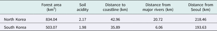 Japanese colonial rulers were likely well informed about the state of natural-resource and labour endowments of the peninsula because they meticulously gathered most of the data that are available for the period from 1910 to 1940s. City-level data collected by Kim et al. (Reference Kim, Park, Park and Cha2018) can provide some information about certain geographical differences between North and South Korea. This dataset contains information about forested area in square kilometres, soil acidity,Footnote 2 distance to coastline in kilometres, distance from major rivers in kilometres and distance from Seoul (capital city of Korea under Japanese rule) in kilometres for 238 inhabited areas on the Korean peninsula. It is possible to divide these areas into those located in today's North and South Korea, respectively (4 out of 238 areas that are now located in the Demilitarized Zone or are divided between North and South Korea are excluded from ensuing analysis). After the division, averages for the mentioned characteristics were calculated for the cities that would become part of North or South Korea, respectively. Results of this calculation are presented in Table 1.