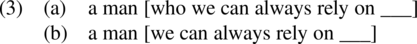 Both these examples contain a relative clause. In (3a), the relative pronoun would traditionally be viewed as a filler, but if it is, there is no obvious filler in (3b). One might suggest that a man (or just man) is the filler in (3b), but then some rethinking is required for examples like (3a). Analyses of relative clauses in which they always contain a visible filler have been developed, notably in Kayne (Reference Kayne1994: Chapter 8), but it is by no means clear that such analyses are viable.Footnote 6 Whatever one thinks about relative clauses, it seems clear that there are UDCs with no visible filler. Consider the following: