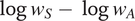The intercept varies as a function of $ {w}_A $ and $ {w}_S $ : the larger $ {w}_A $ is with respect to $ {w}_S $ , the smaller the intercept $ \log {w}_S-\log {w}_A $ and the smaller the set of contexts allowing for syncretism of $ T $ . This captures the desired effect: as it becomes more important to increase decoding accuracy, morphological distinctions are made in a larger set of contexts (and therefore morphological paradigms get larger). However, the slope does not vary as a function of the weights and is therefore constant and equal to $ -1 $ across languages.