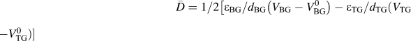 $\bar D = 1/2\left[ {{\varepsilon _{{\rm{BG}}}}/{d_{{\rm{BG}}}}\left( {{V_{{\rm{BG}}}} - V_{{\rm{BG}}}^0} \right) - {\varepsilon _{{\rm{TG}}}}/{d_{{\rm{TG}}}}\left( {{V_{{\rm{TG}}}} - V_{{\rm{TG}}}^0} \right)} \right]$