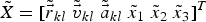 ${\tilde X} = [{\tilde {\vec r}}_{kl} \;{\tilde {\vec v}}_{kl} \;{\tilde {\vec a}}_{kl} \;{\tilde x}_1 \;{\tilde x}_2 \;{\tilde x}_3 ]^T $
